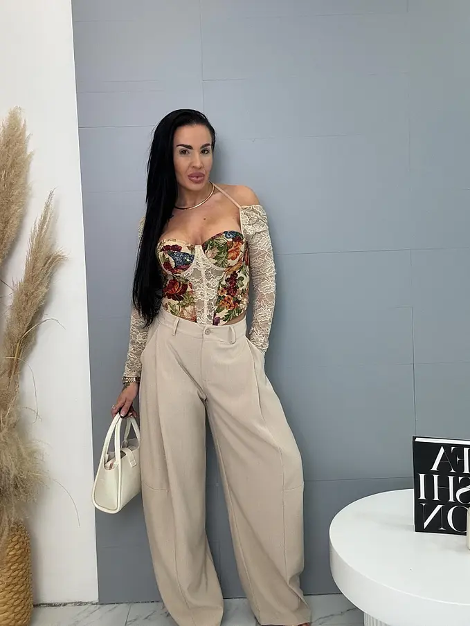 Modelka meria 164 cm a váži 57 kg.