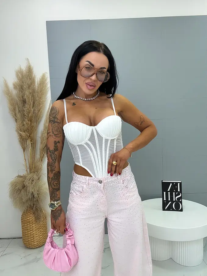 Modelka je 164 cm a váži 57 kg. Na fotení má na sebe veľkosť S