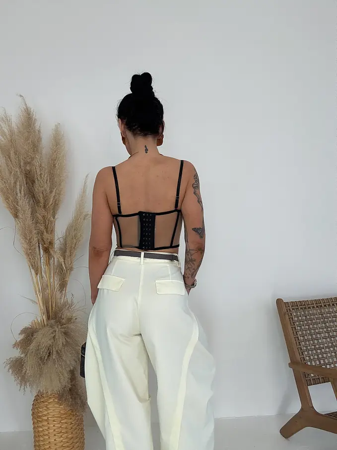 Premium kvalita. Materiál nie je elastický. Nohavce v balónovom strihu. So bočnými vreckami. Bez opasku.