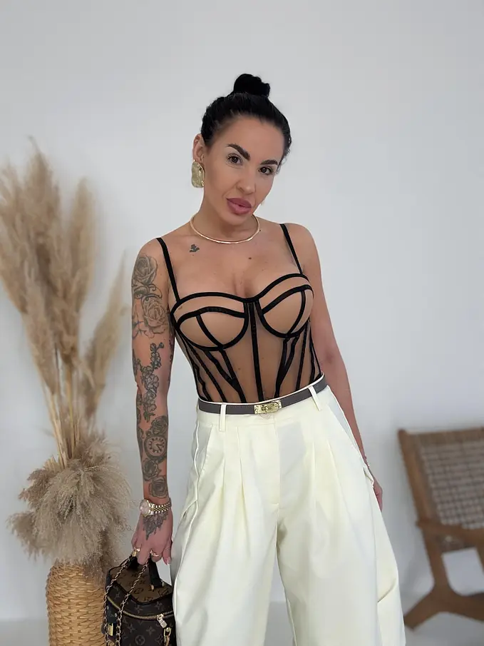 Modelka je 164 cm a váži 57 kg. Má na sebe veľkosť S