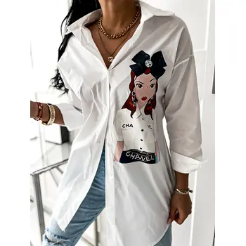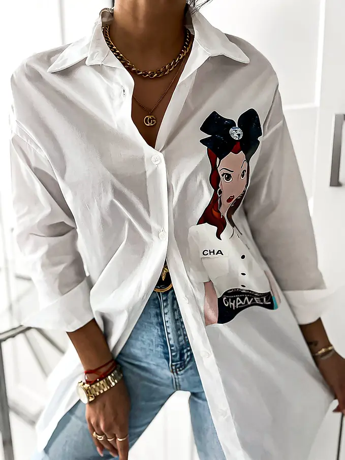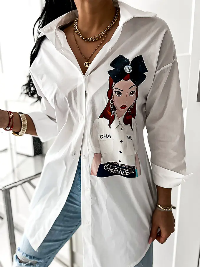Dámska denim košeľa. Materiál nie je elastický. Košeľa s potlačou.
