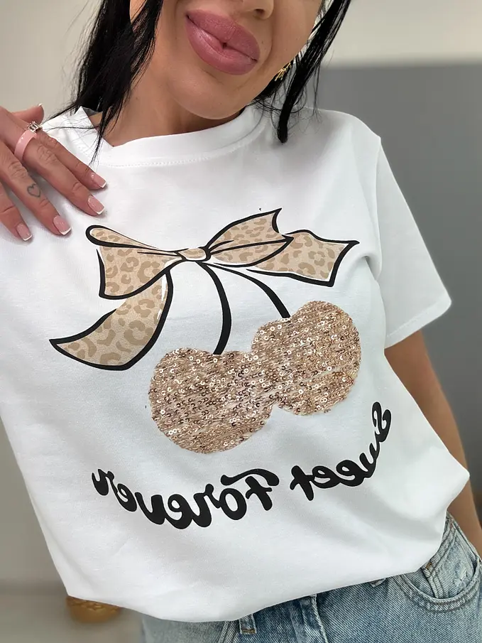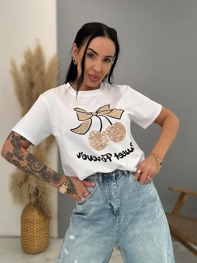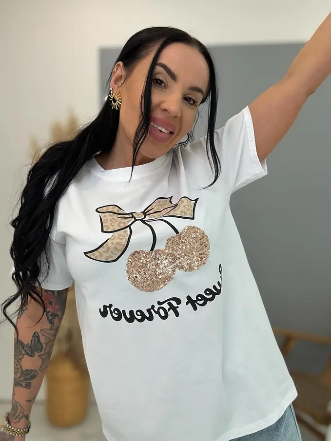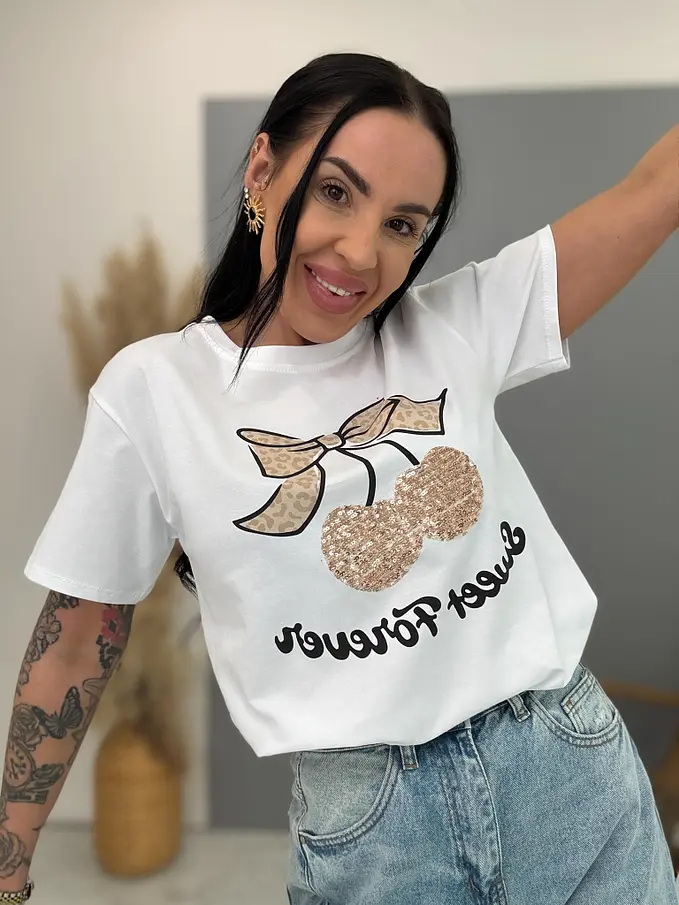 Biele tričko s flitrovým zdobením a potlačou CHERRY GOLD