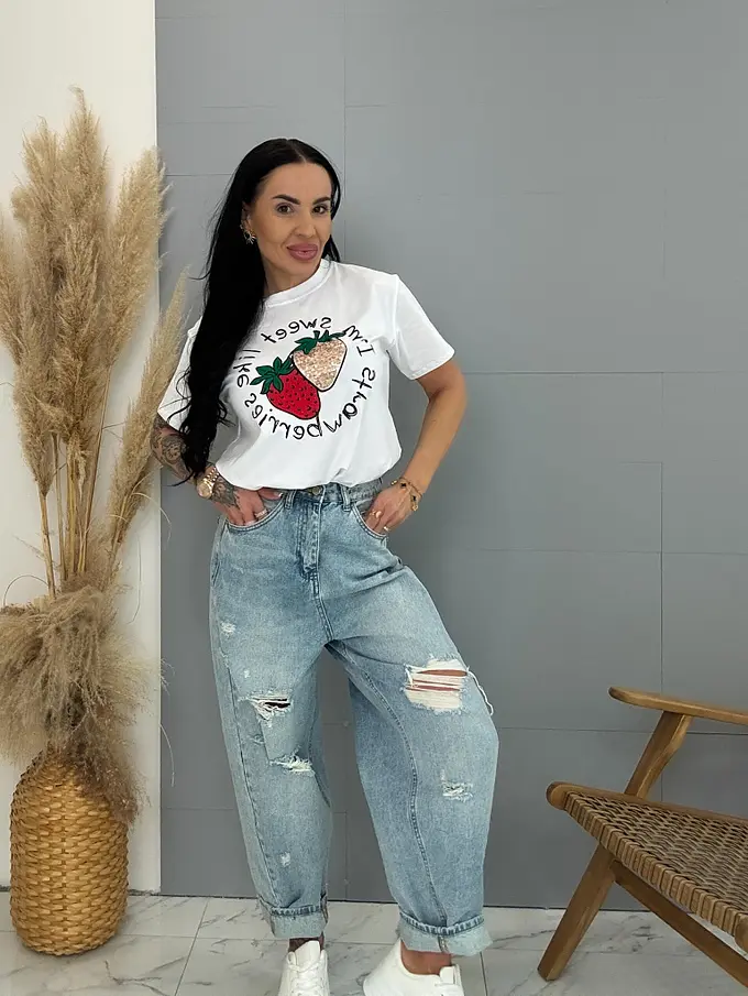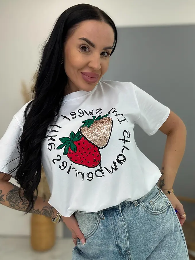 Biele tričko s flitrovým zdobením a potlačou STRAWBERRY