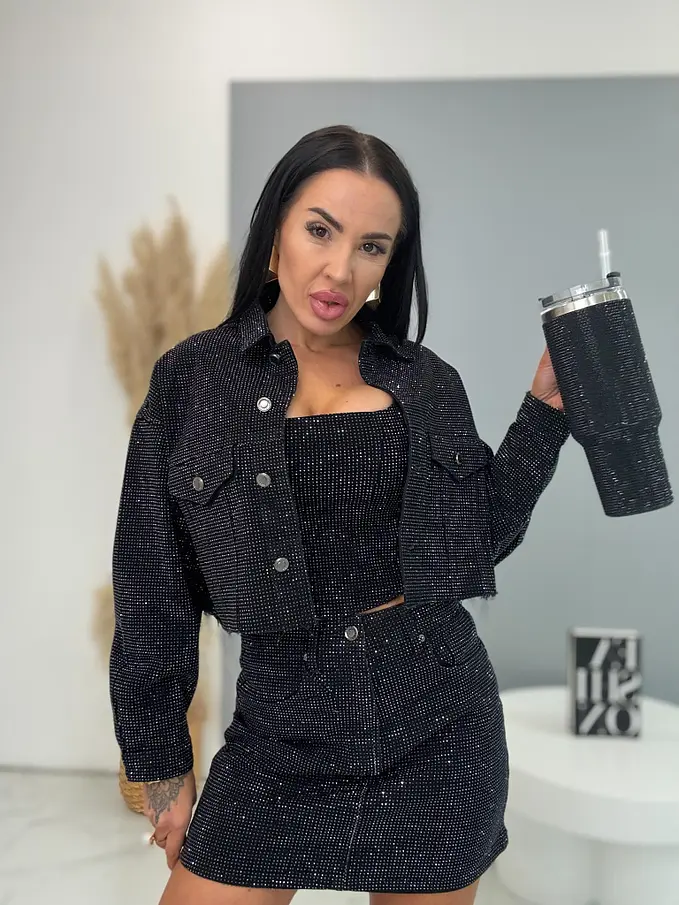 Black crop denim jacket s kamienkami CRYSTAL