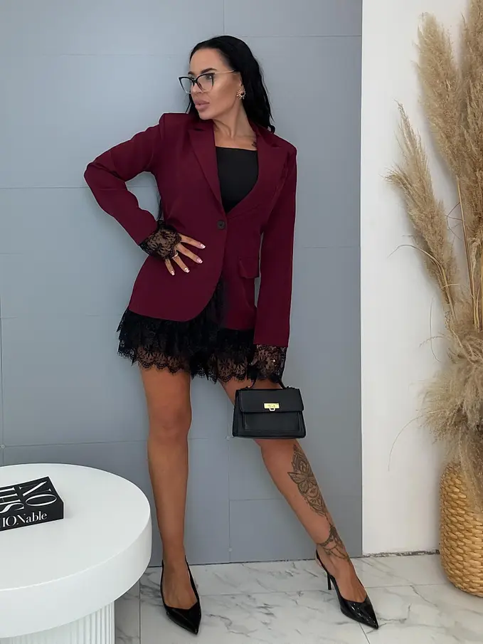 Dámske sako z príjemného materiálu. Materiál nie je elastický. Sako sa zapína na gombík. Má vypchávky v oblasti ramien. Priehľadnými čipkovými vsadkami.