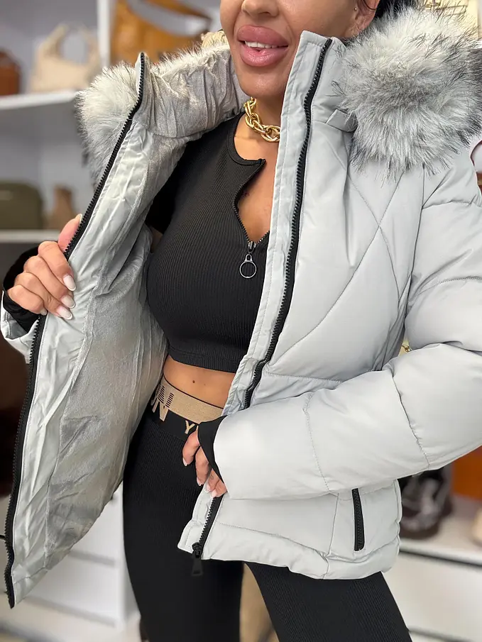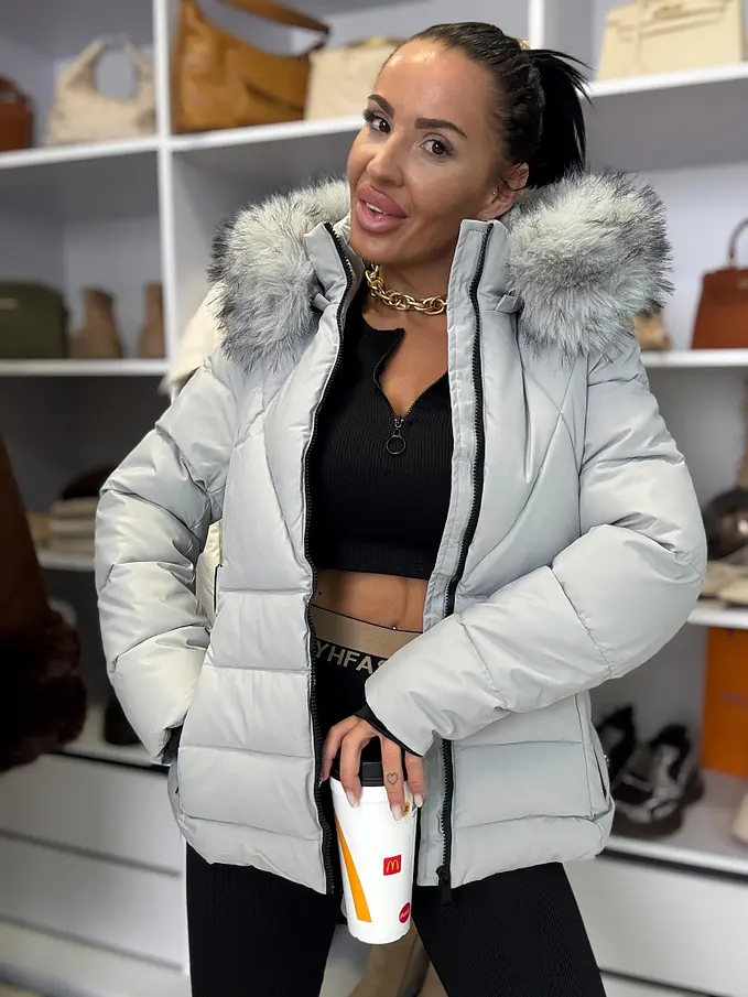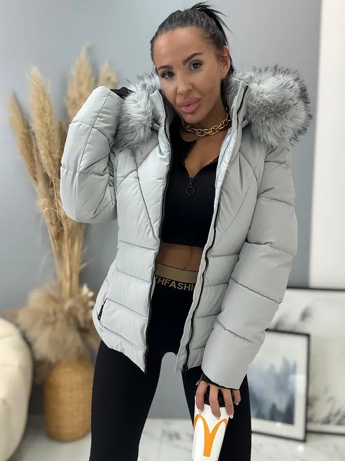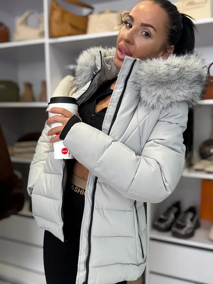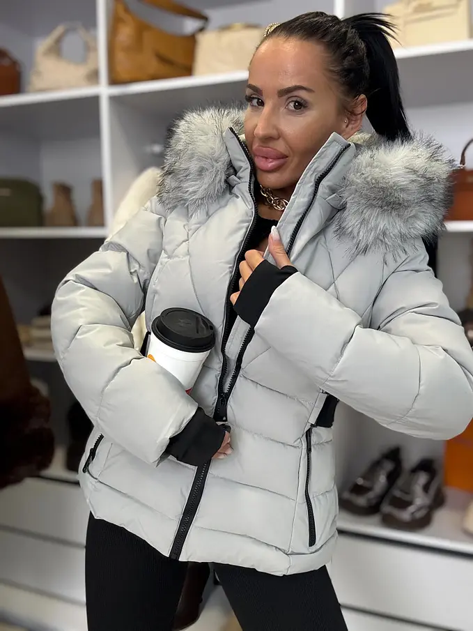 Bunda s odnímateľným kožušinovým lemom na golieri. S odnimateľnou kapucňou. S bočnými vreckami. Ozdoba v čiernej farbe.