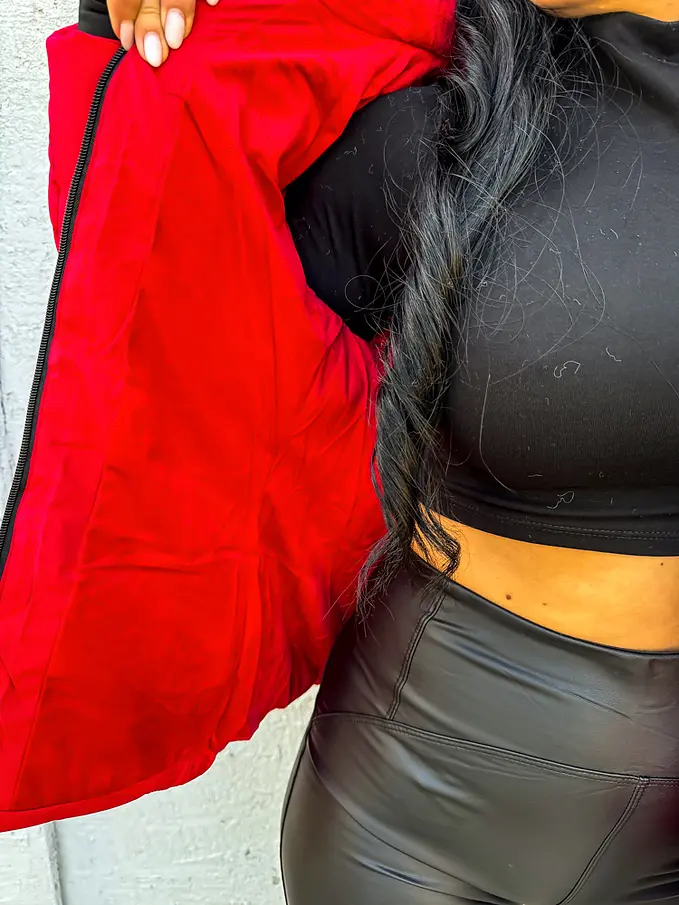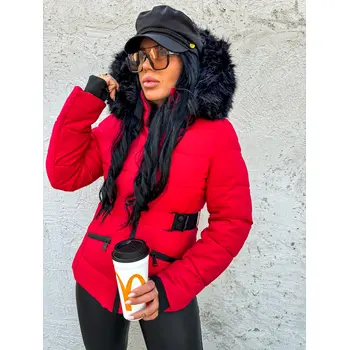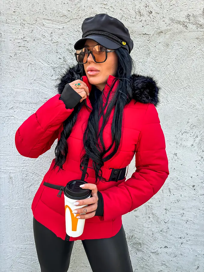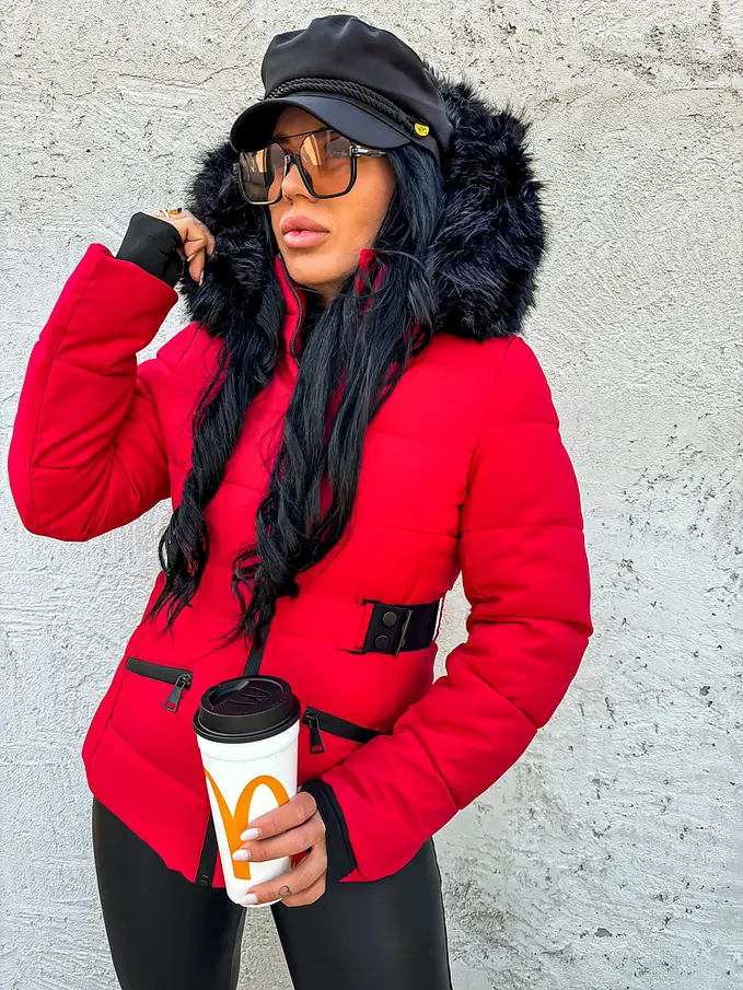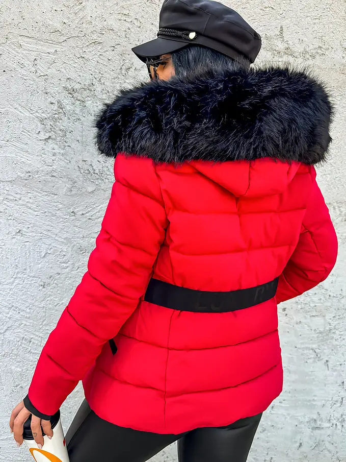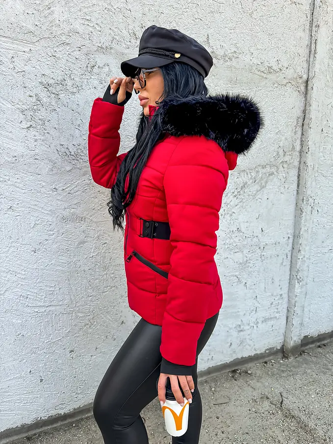 Červená štepovaná bunda s kapucňou a opaskom ISLA