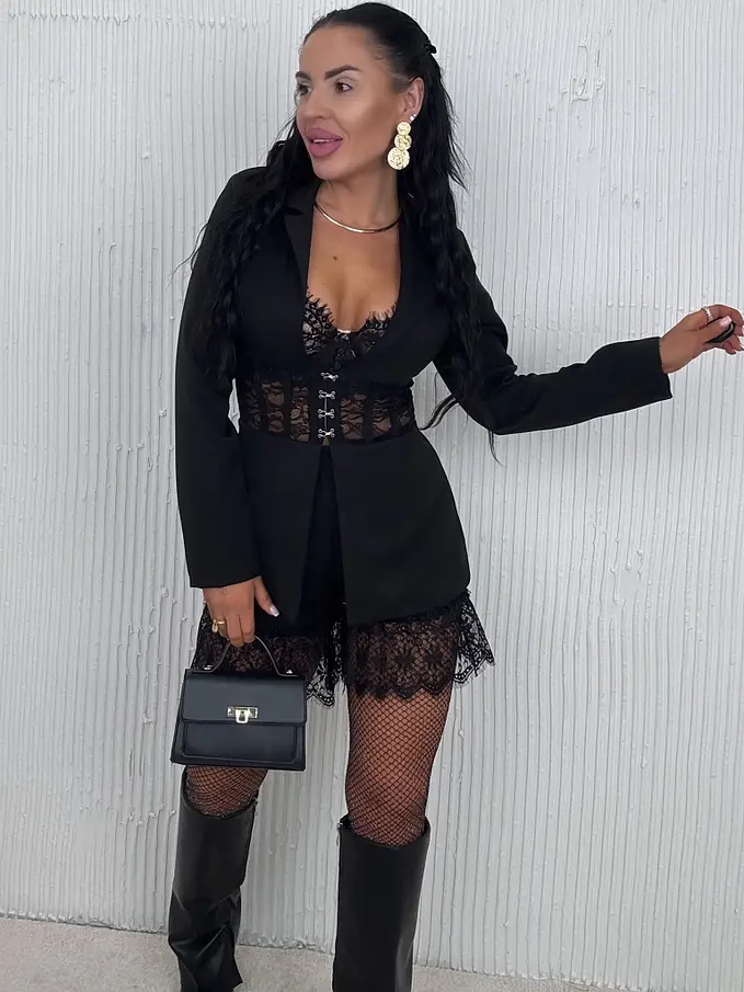 Dámske sako z príjemného materiálu. Materiál nie je elastický. Sako sa zapína na spony. Má vypchávky v oblasti ramien. Priehľadnými čipkovými vsadkami.