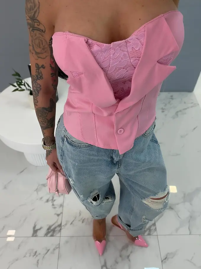 Čierny top zdobený čipkou a gombíkmi s vypchávkami.