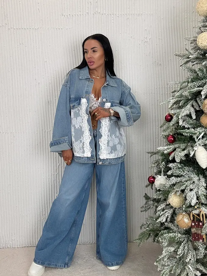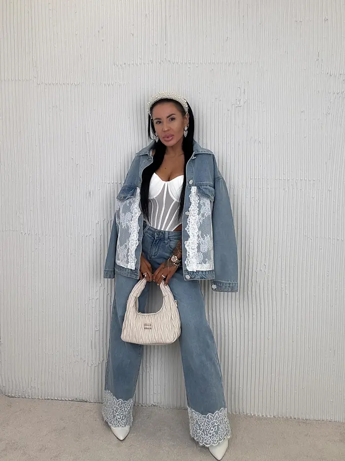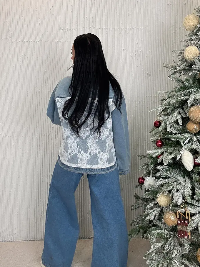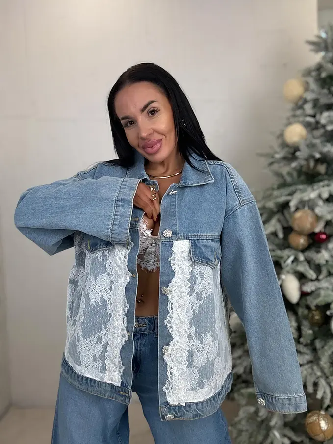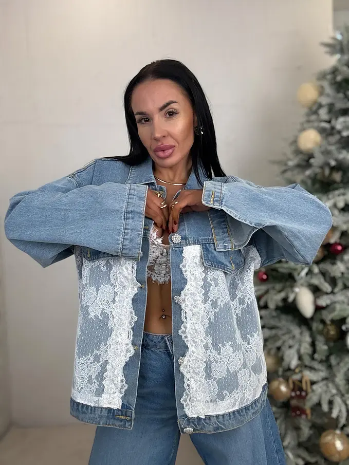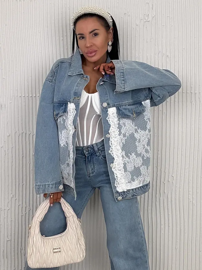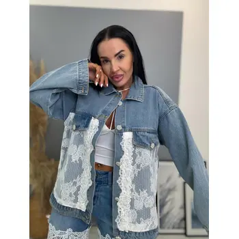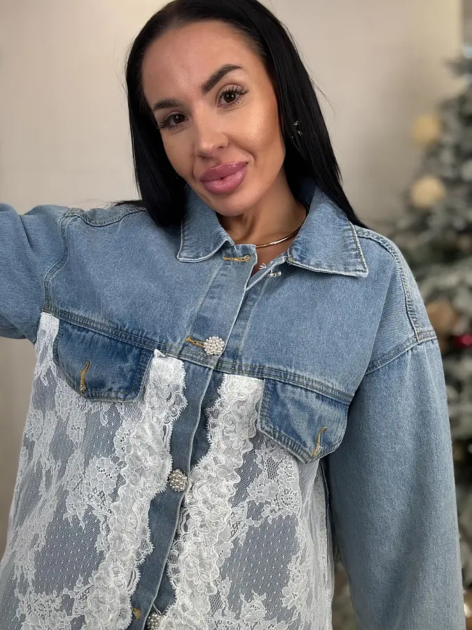Dámsky denim kabát s ozdobnou čipkou. Materiál je príjemný, a mierne elastický. Strieborné gombíky sú zdobené perlami.