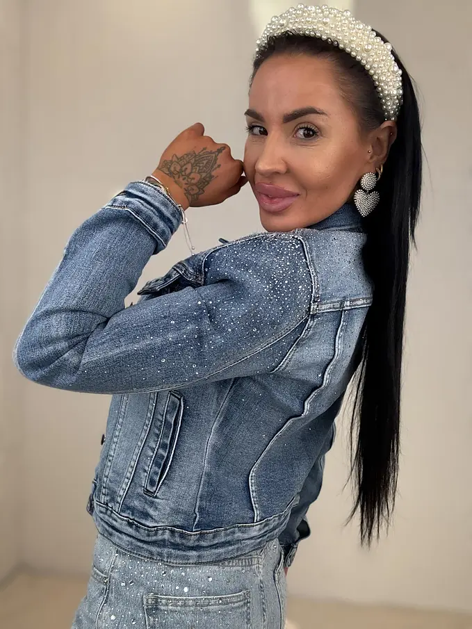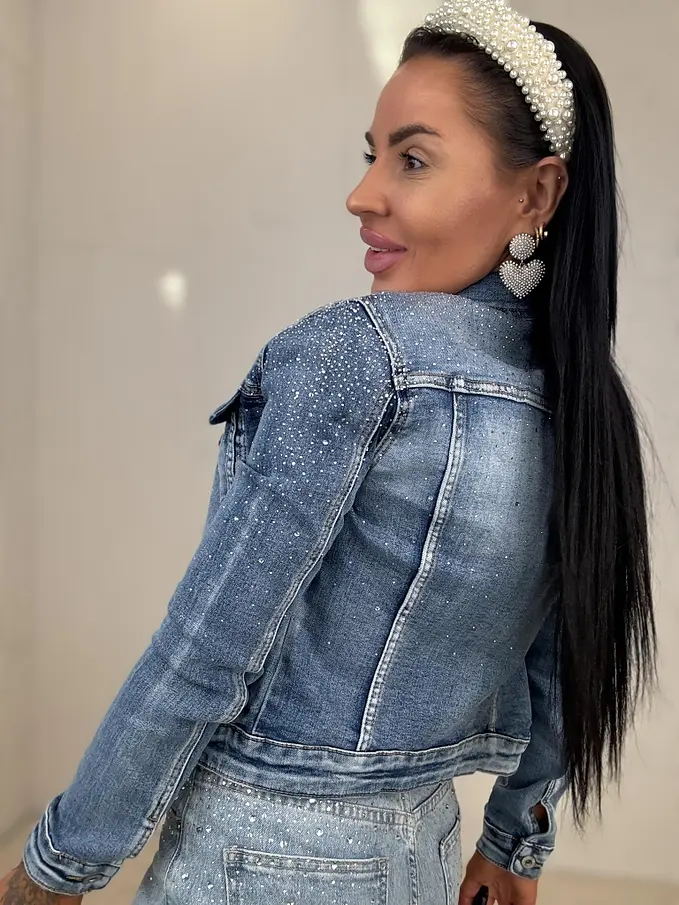 Dámsky denim kabát s ozdobnými kamienkami. Materiál je príjemný, a mierne elastický. Gombíky majú striebornú farbu.