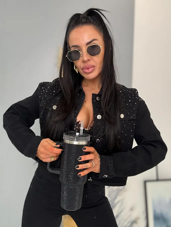 Dámsky denim kabát s ozdobnými kamienkami. Materiál je príjemný, a mierne elastický. Gombíky majú striebornú farbu.