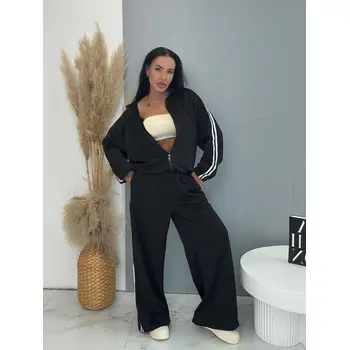 Dámsky komplet z novej kolekcie. Pozostáva z mikiny a nohavíc. Nohavice majú gumený pás a bočné vrecká. Materiál je príjemný, elastický.