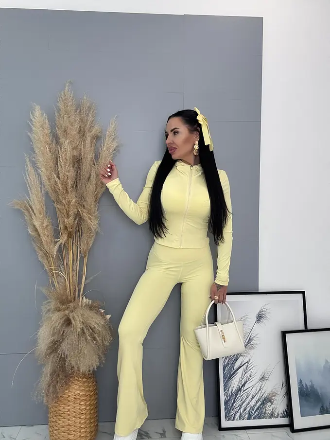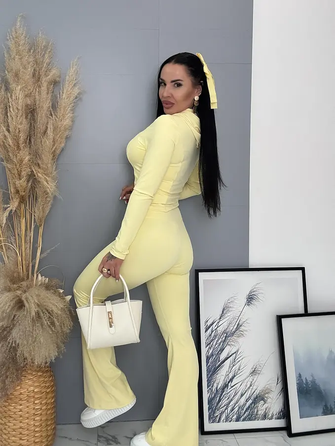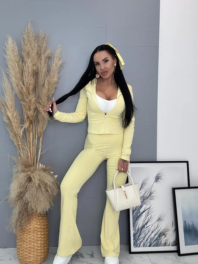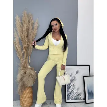 Dámsky komplet z novej kolekcie. Pozostáva z mikiny a nohavíc. Nohavice majú gumený pás. Materiál je príjemný, elastický.