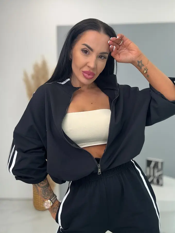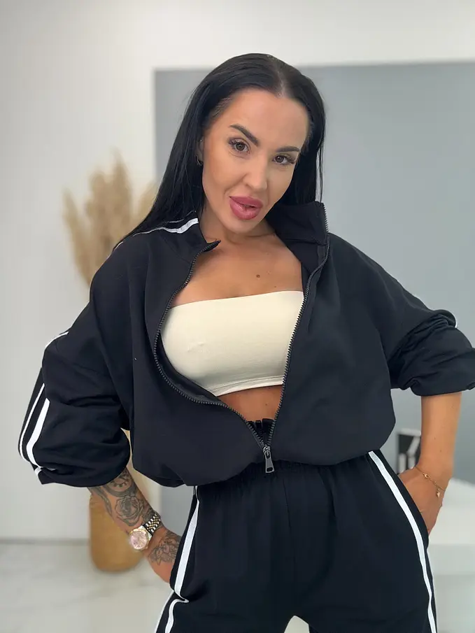 Dámsky komplet z novej kolekcie. Pozostáva z mikiny a nohavíc. Nohavice majú gumený pás a bočné vrecká. Materiál je príjemný, elastický. Mikina so zipsom a má stiahnutý spodný lem.