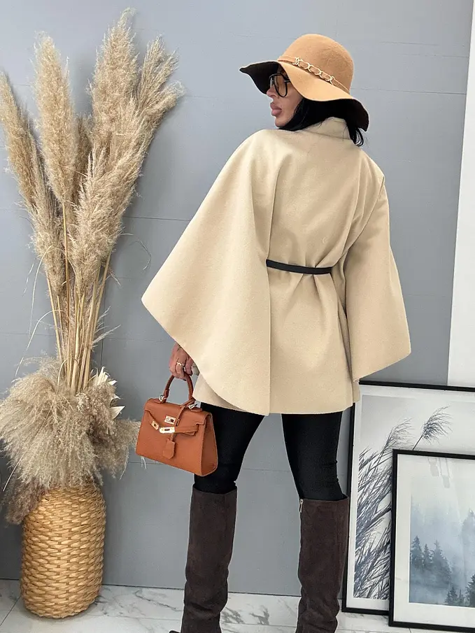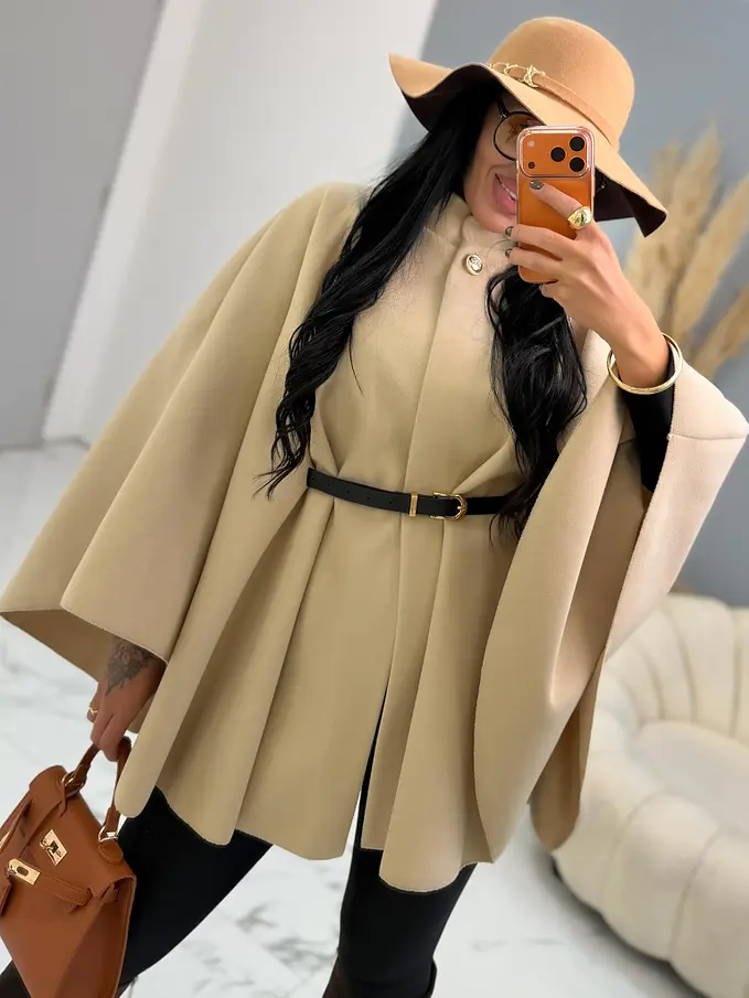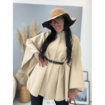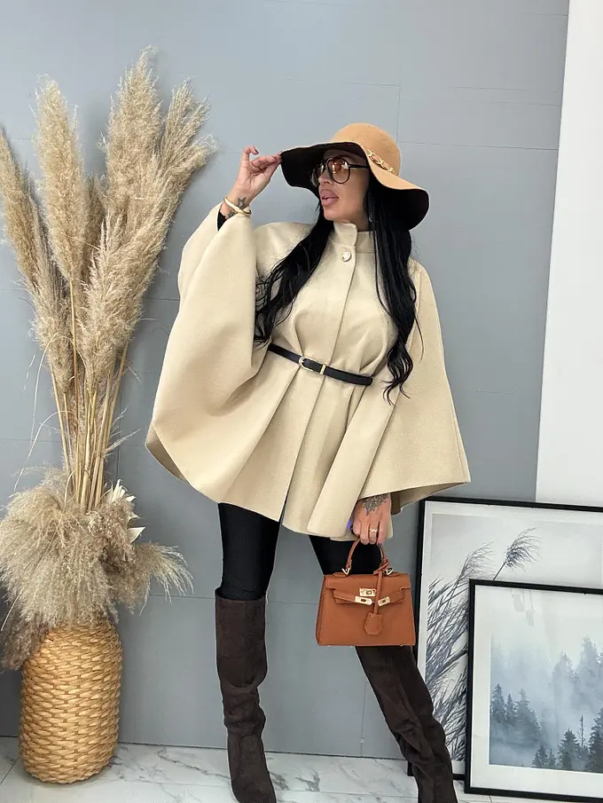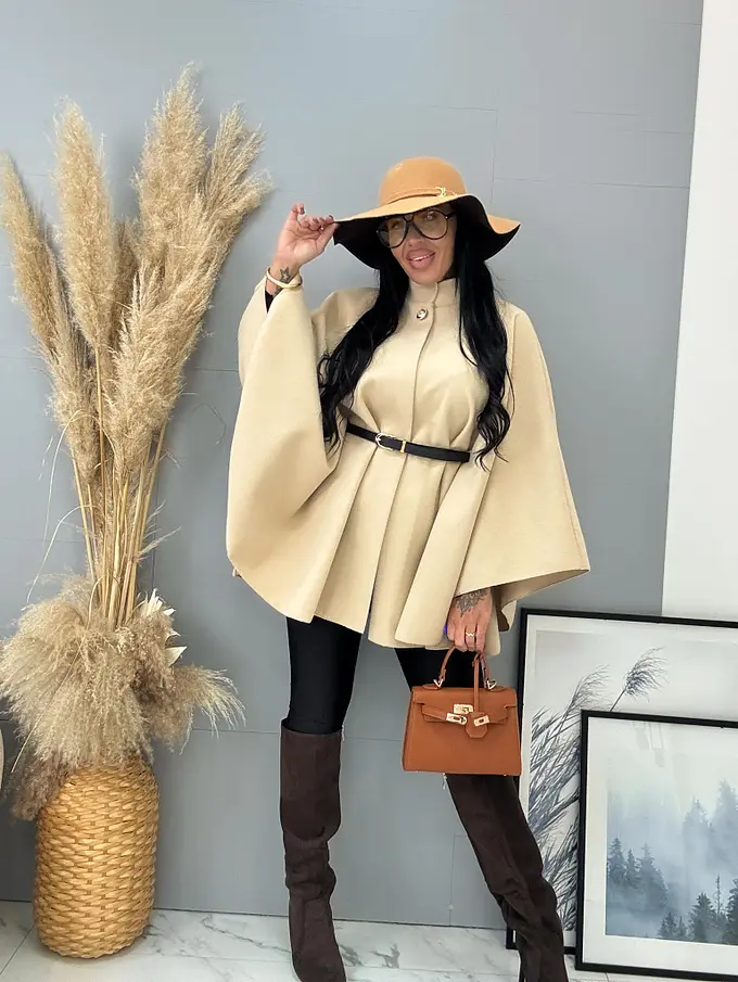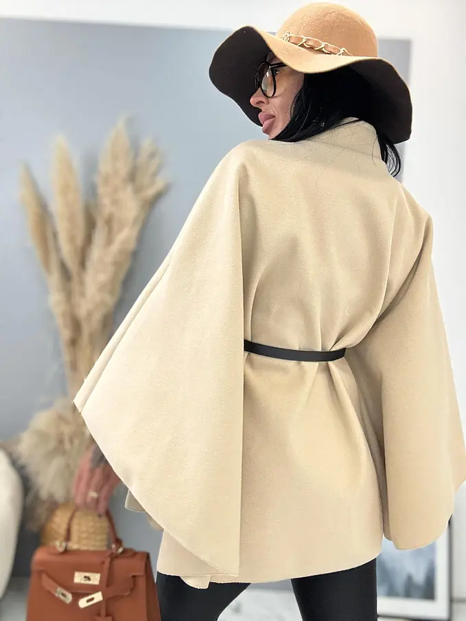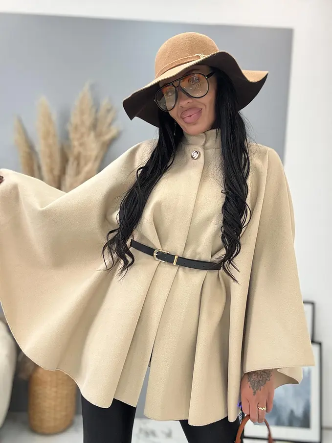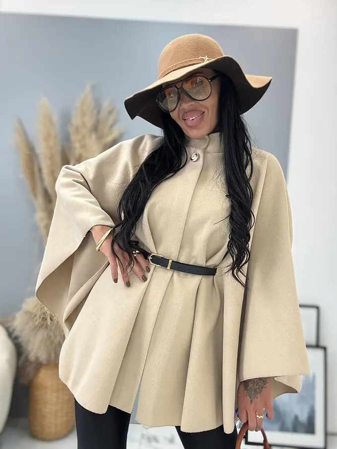 Premium kvalita. Dámske asymetrické pončo doplnené moderným opaskom v čiernej farbe. Pončo je asymetrického strihu, vďaka ktorému pôsobí luxusne. Materiál nie je elastický. Kabát sa zapína na jeden zlatý gombík.