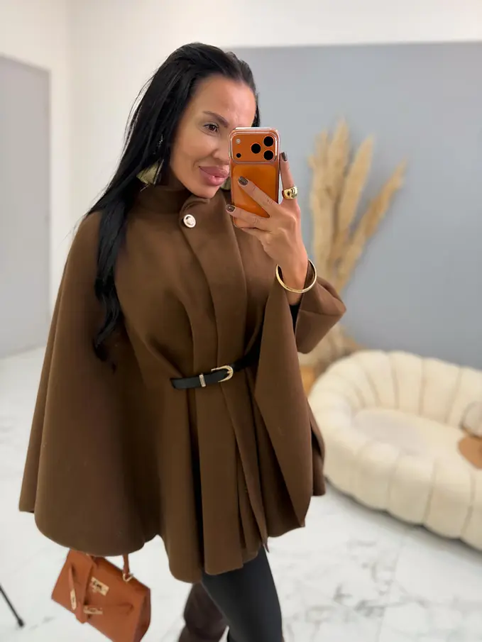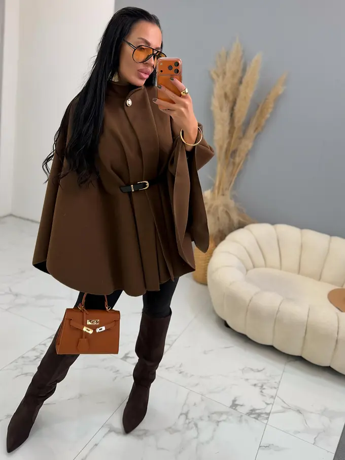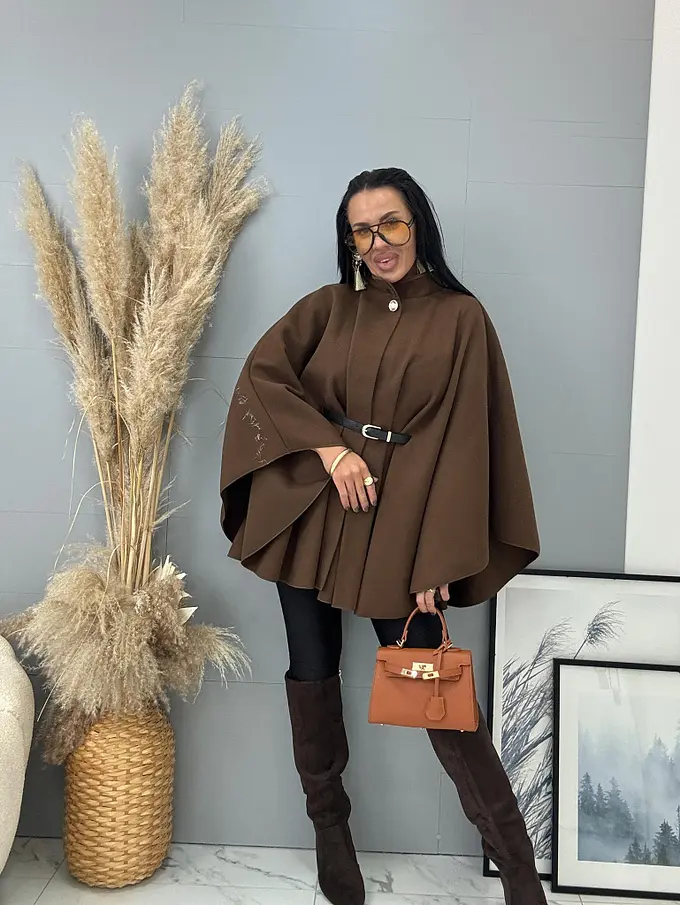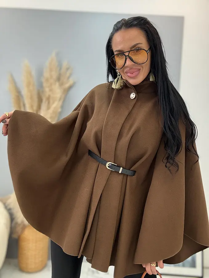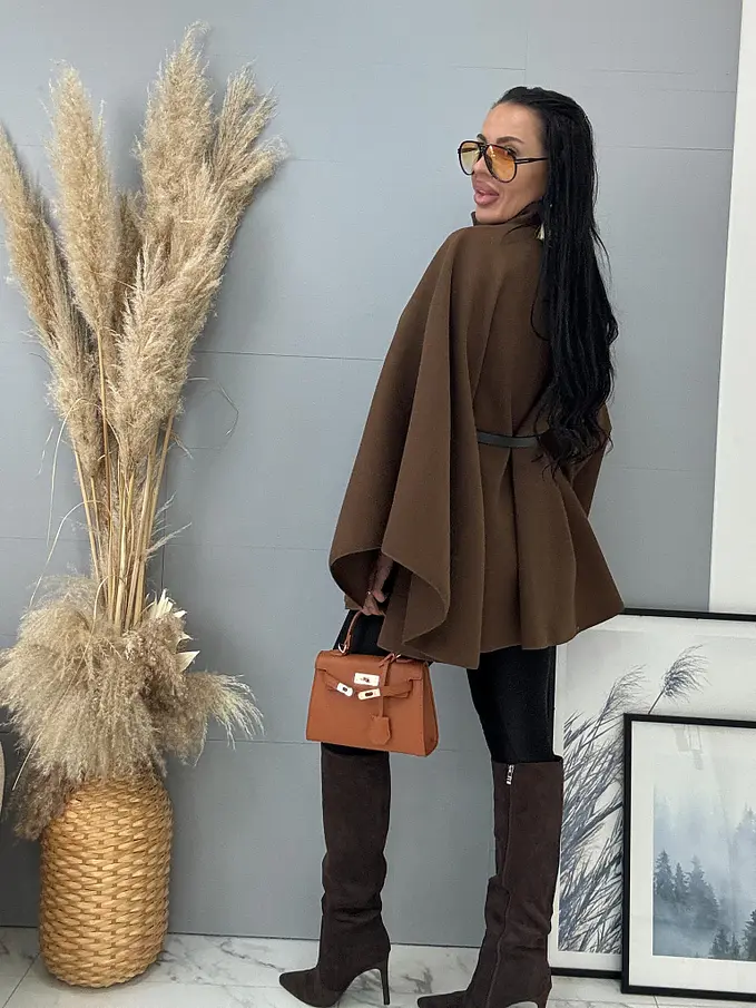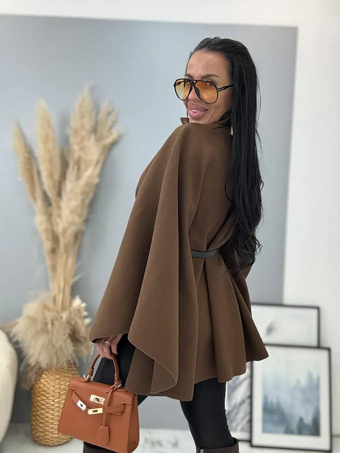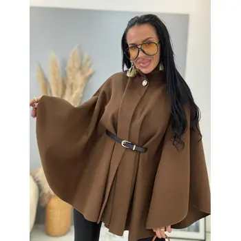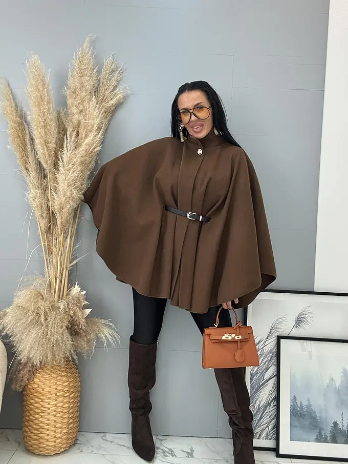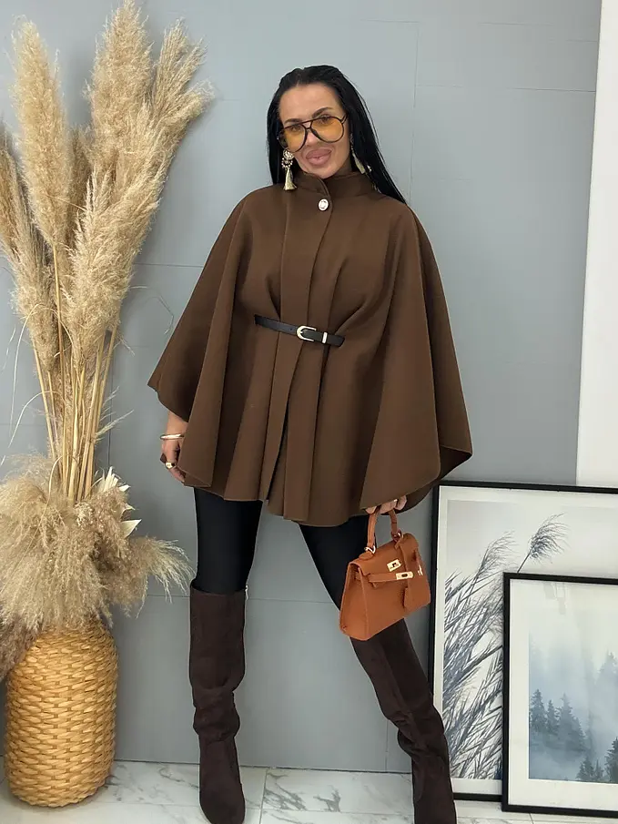 Premium kvalita. Dámske asymetrické pončo doplnené moderným opaskom v čiernej farbe. Pončo je asymetrického strihu, vďaka ktorému pôsobí luxusne. Materiál nie je elastický. Kabát sa zapína na jeden zlatý gombík.