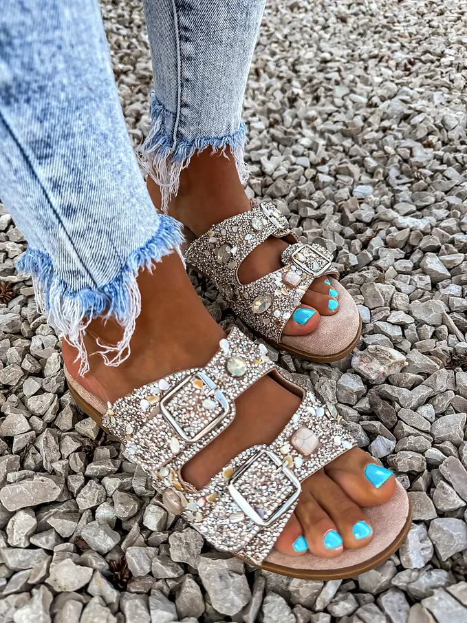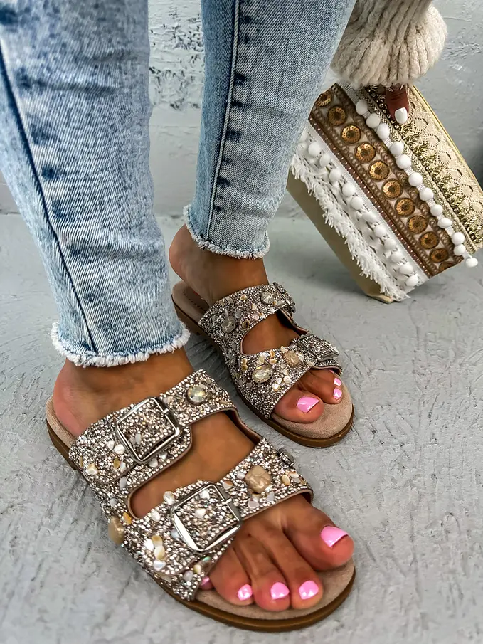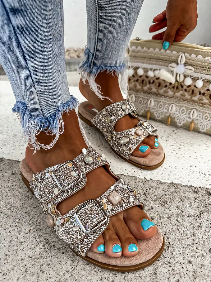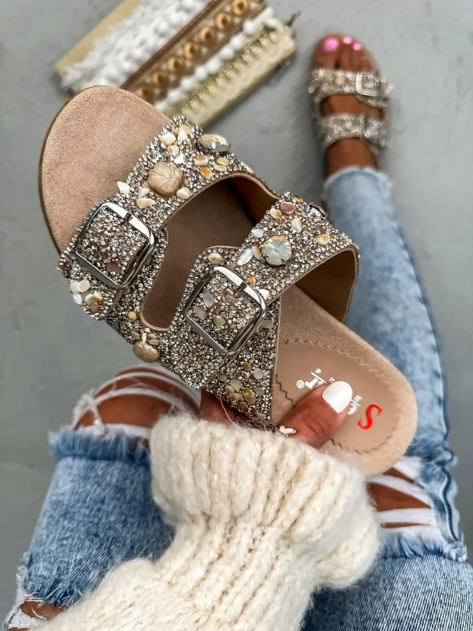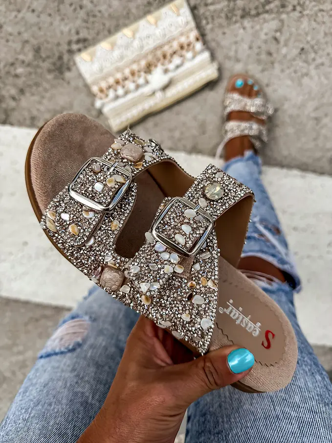 Pohodlné šľapky na každú príležitosť. Kamienky majú bézovú a bielu farbu.