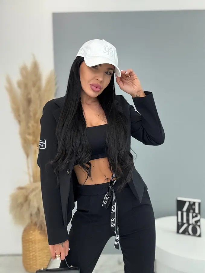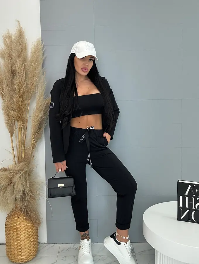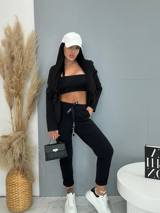 Teplákový oblek je ideálnou voľbou pre moderné ženy. Pozostáva zo saka a nohavíc. Materiál je príjemný a elastický. Ľahké sako sa zapína na gombík a na jednom z rukávov sa nachádza nášivka. Látkové nohavice majú bočné vrecká a gumený pás.