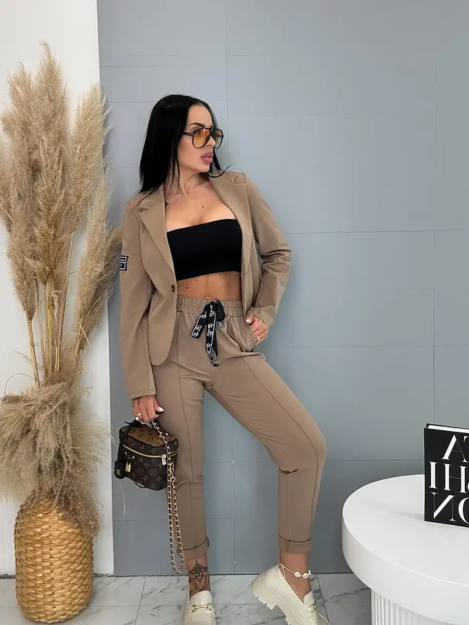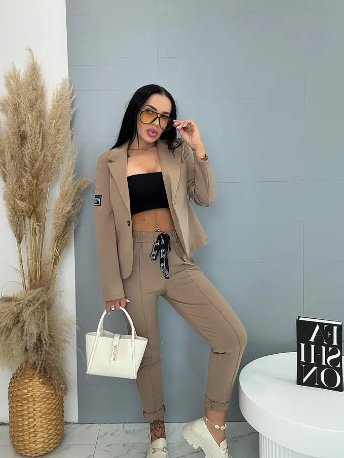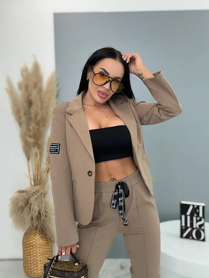 Teplákový oblek je ideálnou voľbou pre moderné ženy. Pozostáva zo saka a nohavíc. Materiál je príjemný a elastický. Ľahké sako sa zapína na gombík a na jednom z rukávov sa nachádza nášivka. Látkové nohavice majú bočné vrecká a gumený pás.