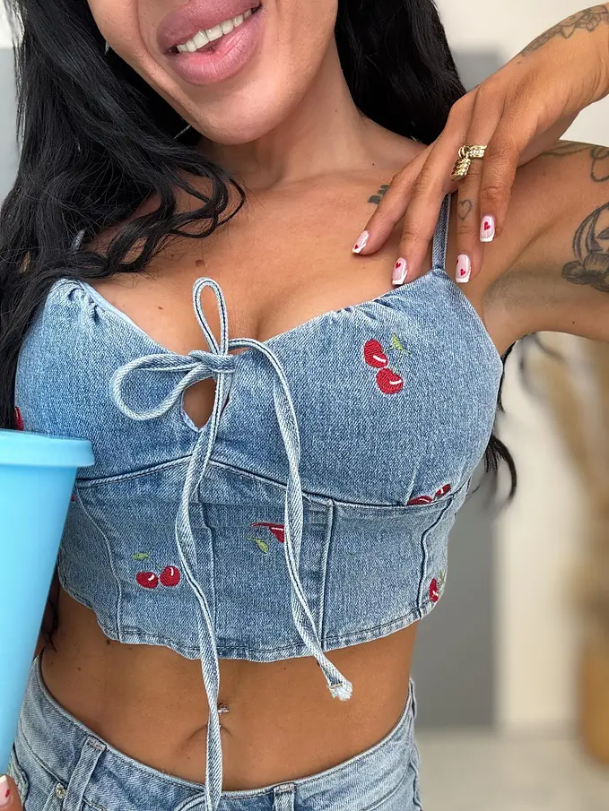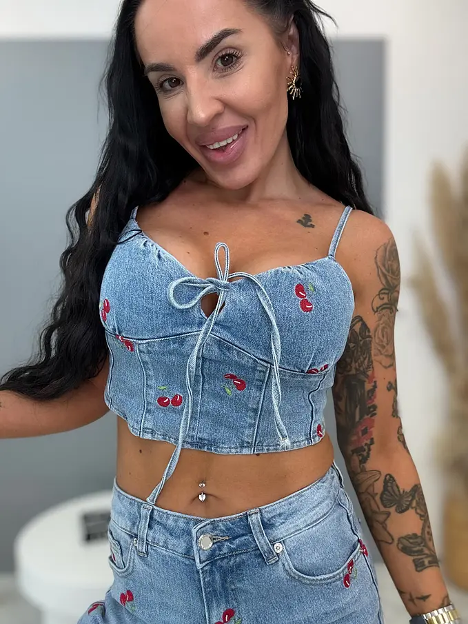 Denim crop-top zdobené s čerešňovou výšivkou CHERRY