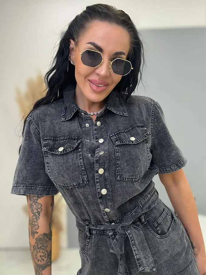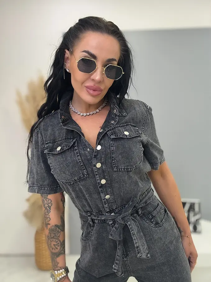Overal s krátkymi rukávmi a golierom predstavuje moderný a zároveň praktický kúsok vhodný do každého šatníka. Zapínanie na strieborné cvoky zabezpečuje pohodlné obliekanie a dodáva modelu nenápadný dizajnový prvok. Súčasťou je opasok, ktorý pekne zvýrazní pás a vytvorí lichotivú siluetu. Predná časť je ozdobená dvoma nefunkčnými náprsnými vreckami a doplnená o praktické bočné vrecká pre väčší komfort pri nosení.