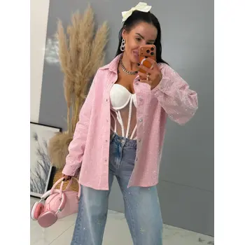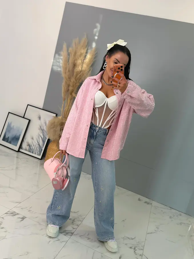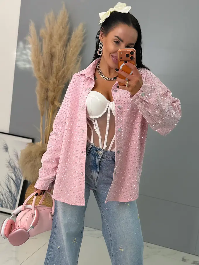 Dámska denim košeľa s ozdobnými kamienkami. Materiál nie je elastický. Zapínania na spony sú striebornej farby.