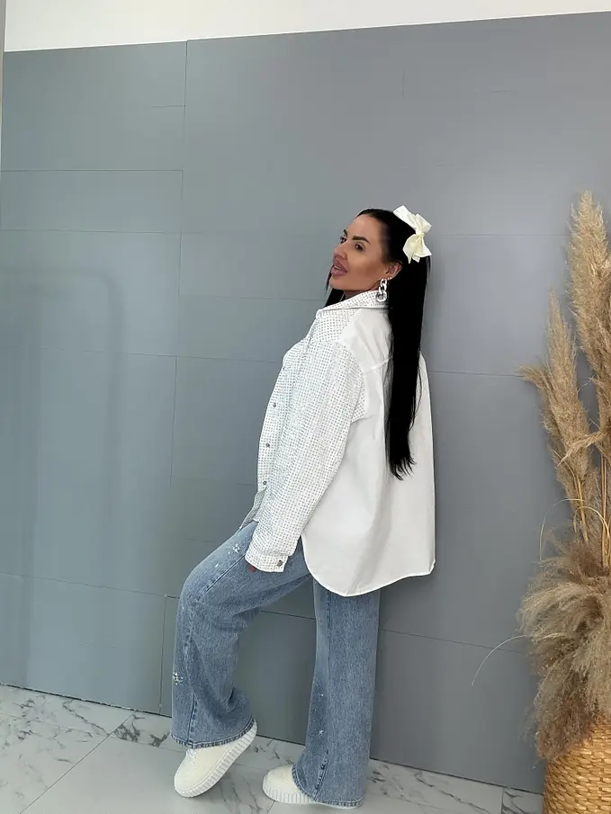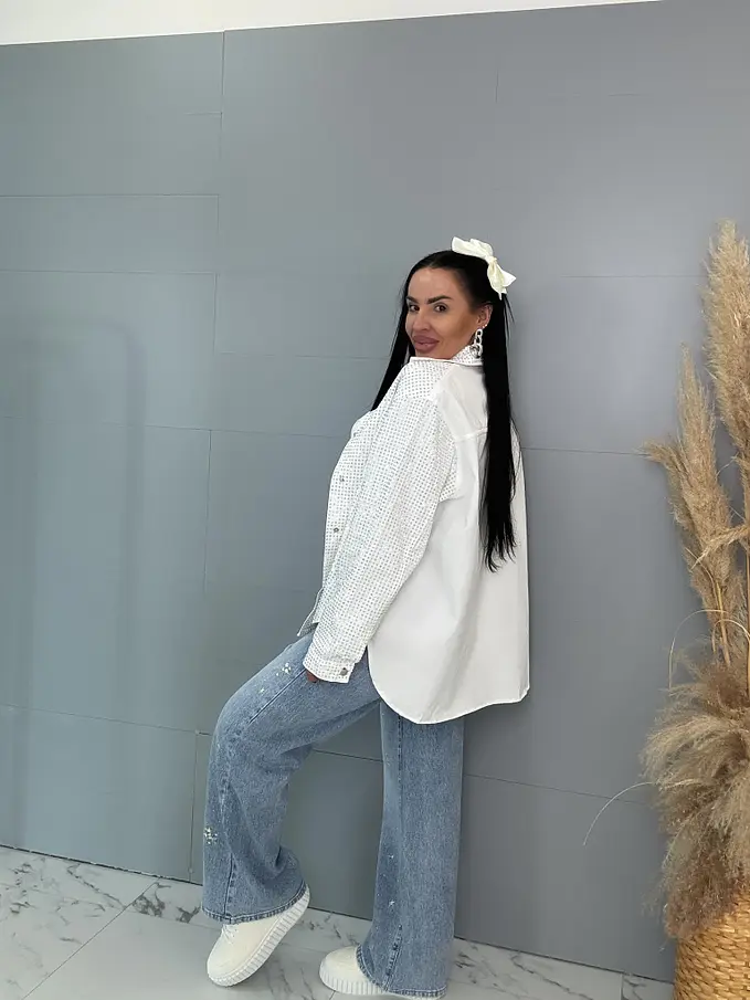Dámska denim košeľa s ozdobnými kamienkami. Materiál nie je elastický. Zapínania na spony sú striebornej farby.
