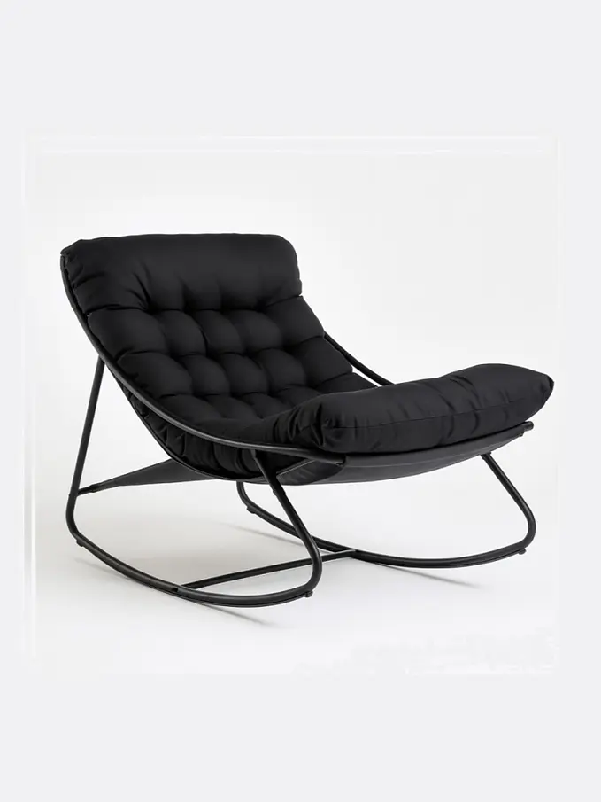 Toto je elegantné, moderné hojacie kreslo s mäkkým prešívaným čalúnením v tmavom odtieni.