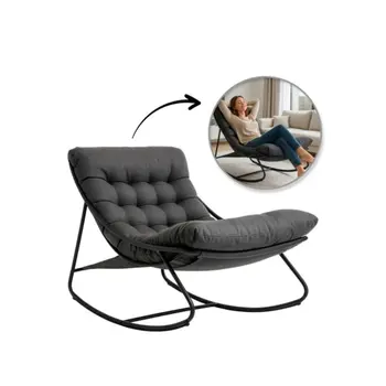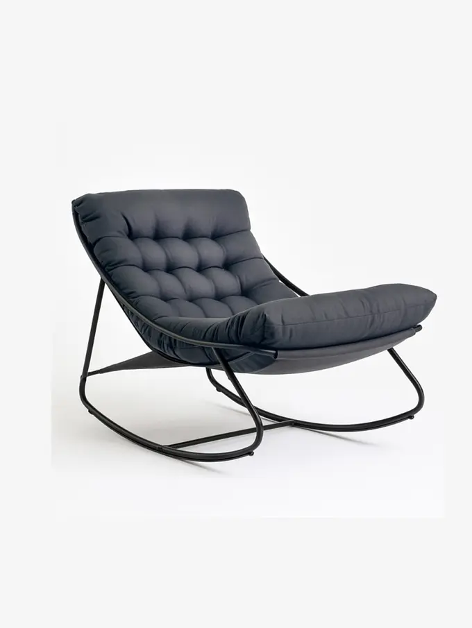 Toto je elegantné, moderné hojacie kreslo s mäkkým prešívaným čalúnením v tmavom odtieni.