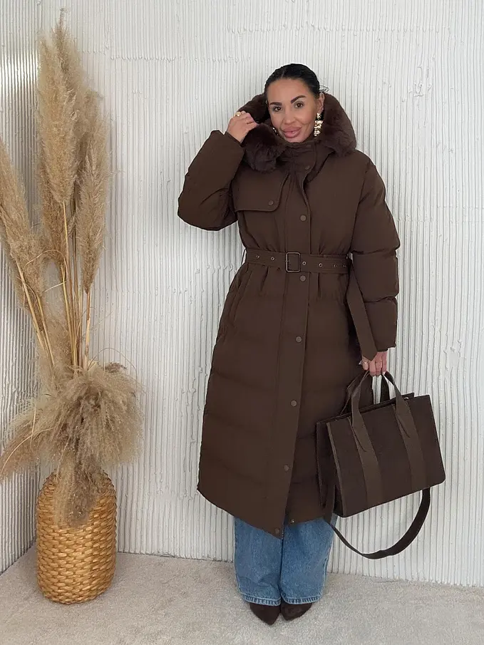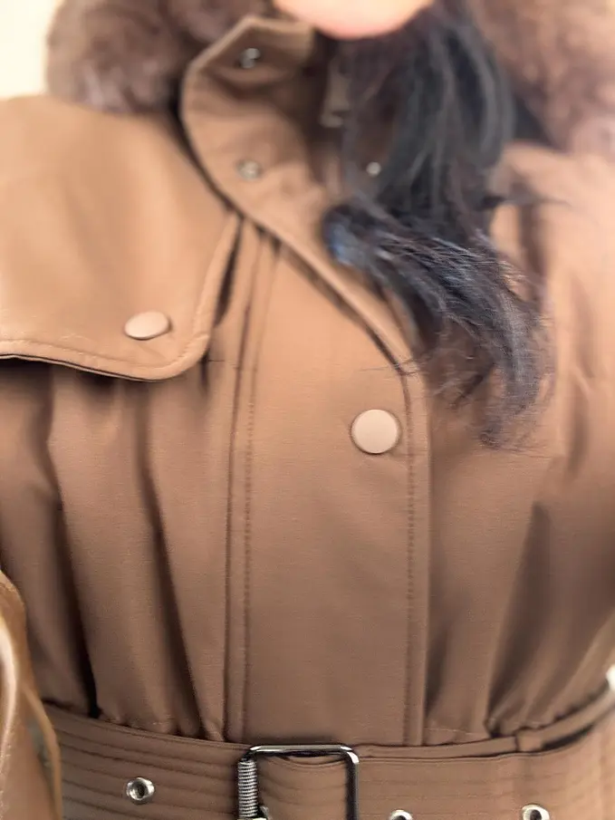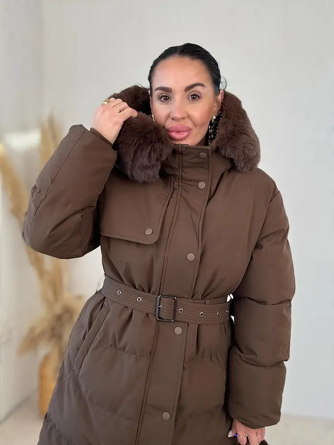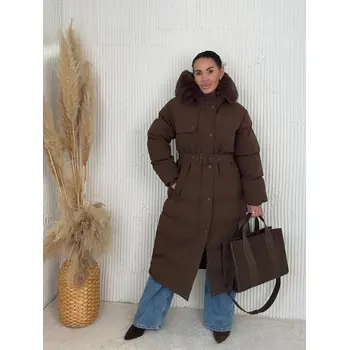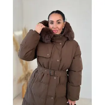 Bunda s odnímateľným kožušinovým lemom na kapucn. S neodnimateľnou kapucňou. S bočnými vreckami. Ozdoba v hnedej farbe. S opaskom.