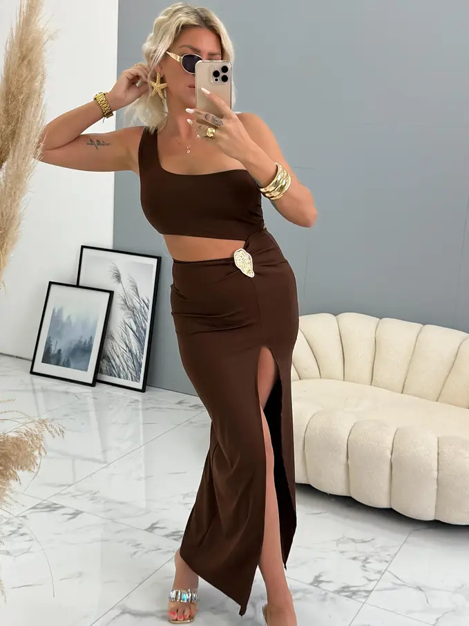 Modelka čiernovláska meria 164 cm a váži 64 kg. Nosí veľkosť M/L. Miery: 99 cm - 74 cm - 93 cm.