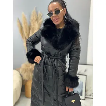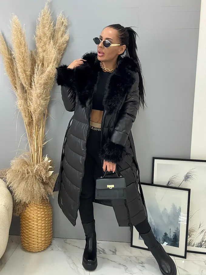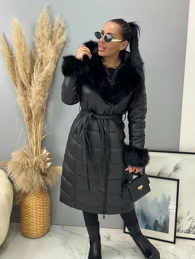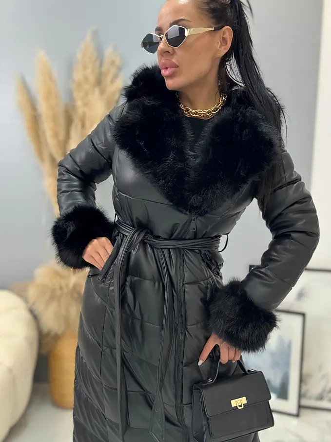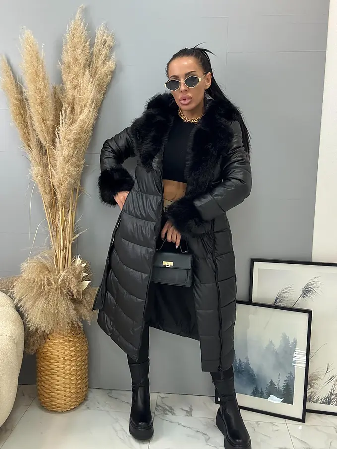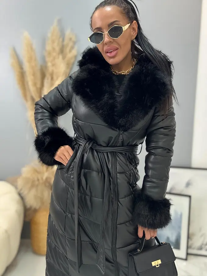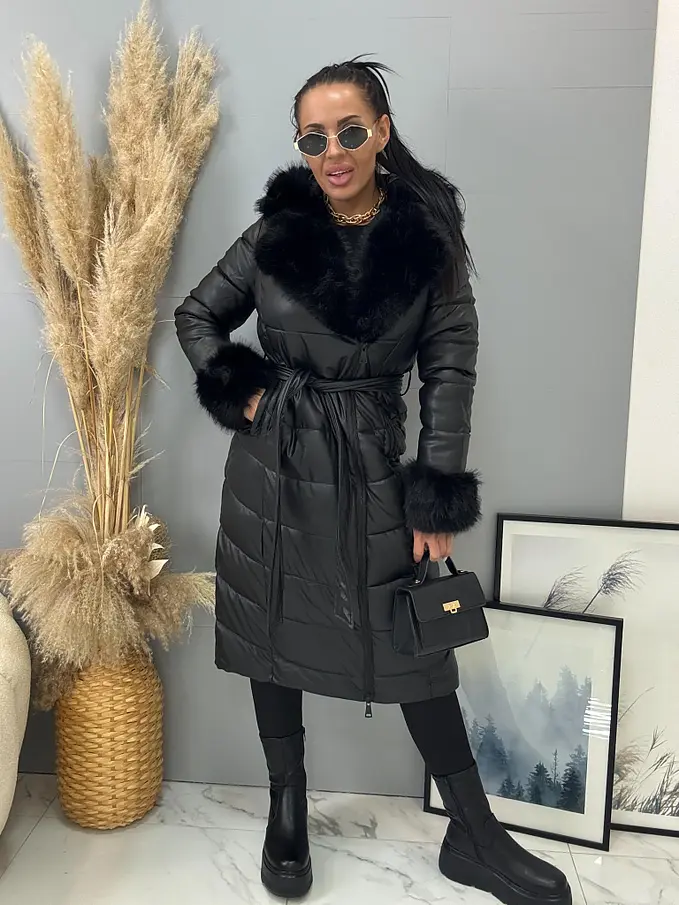 Dlhý koženkový kabát s kožušinou a opaskom NIVORA