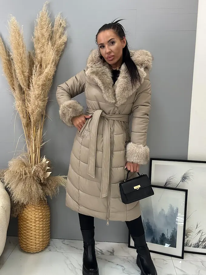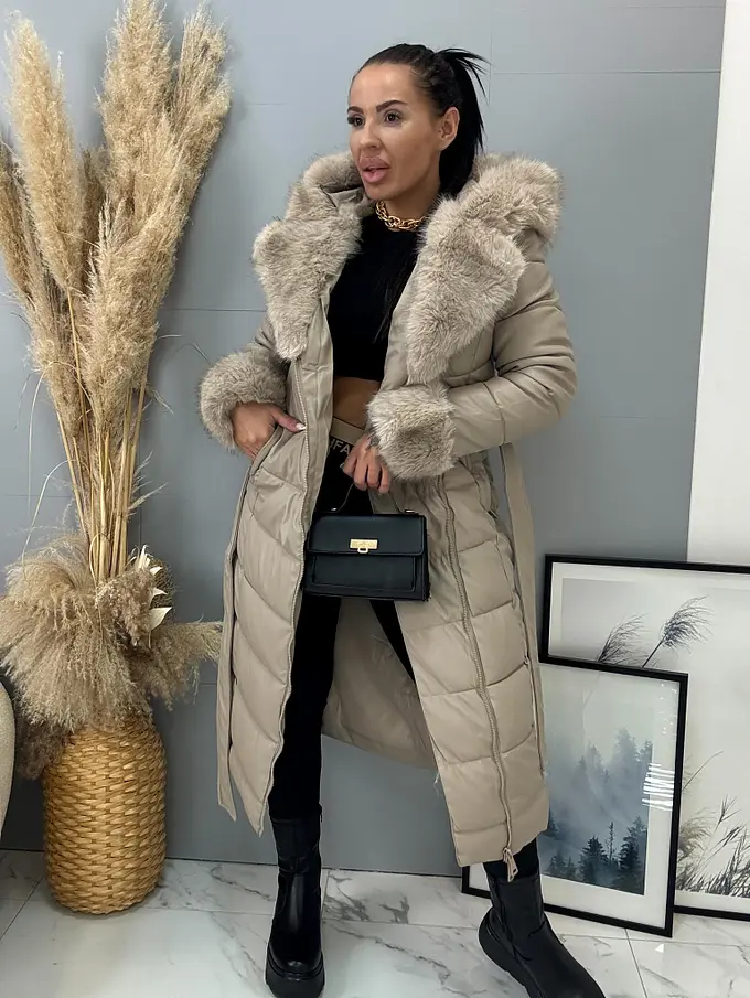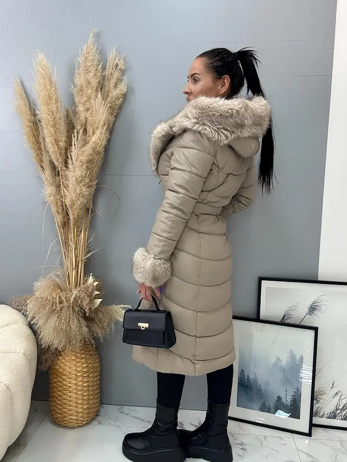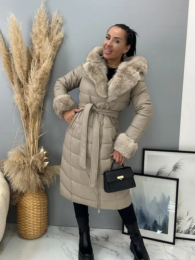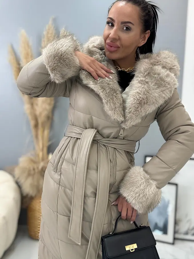 Dlhý koženkový kabát s kožušinou a opaskom NIVORA