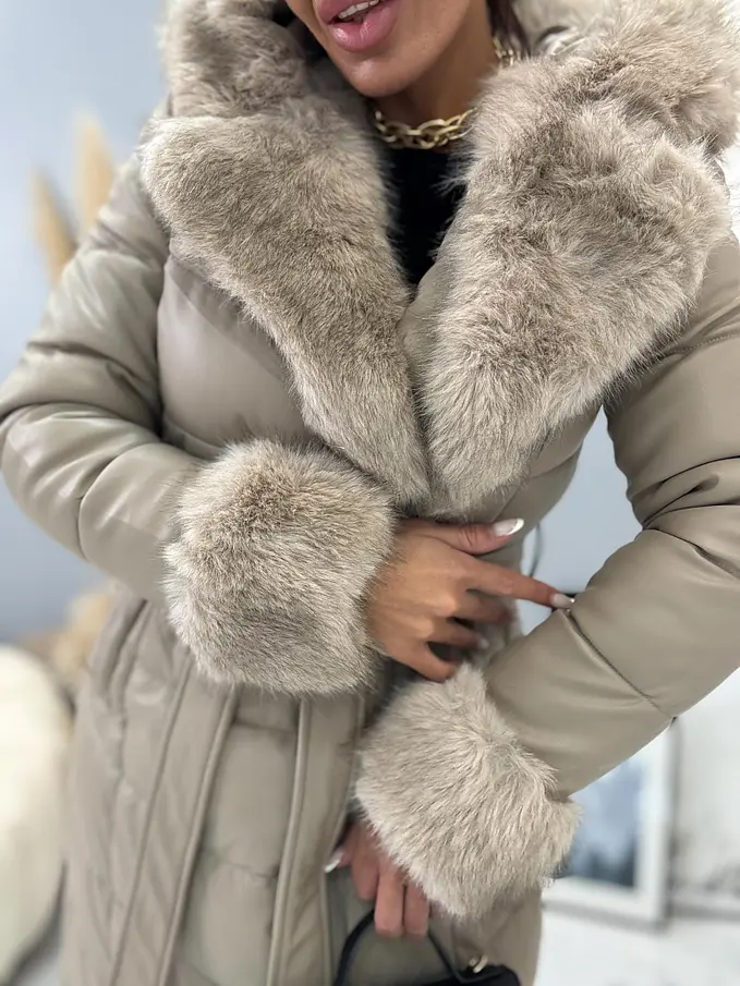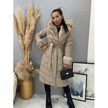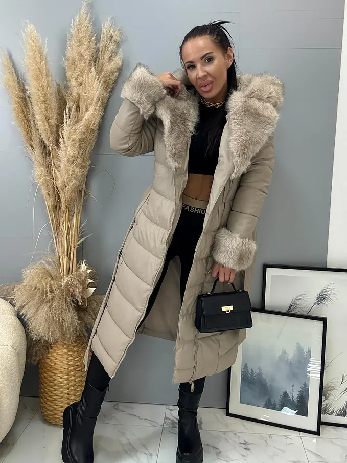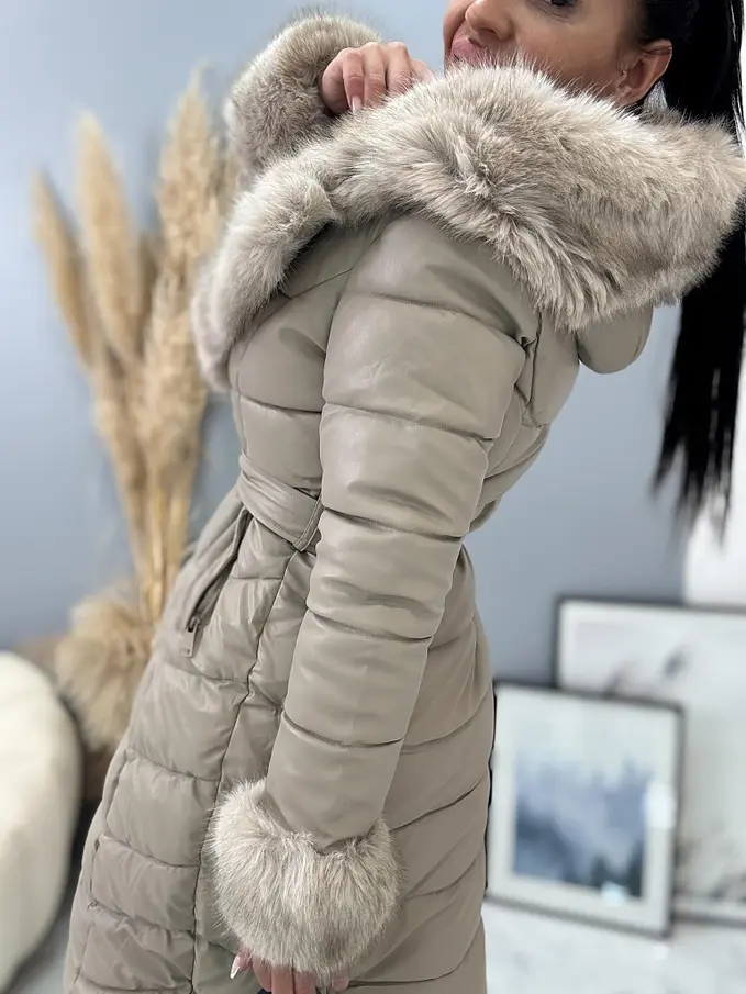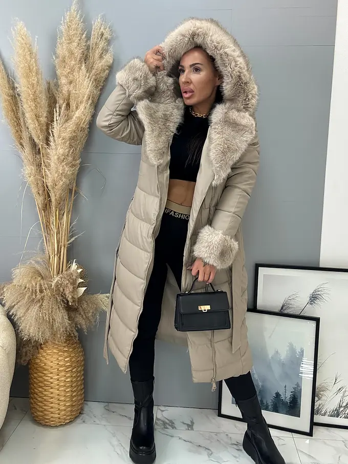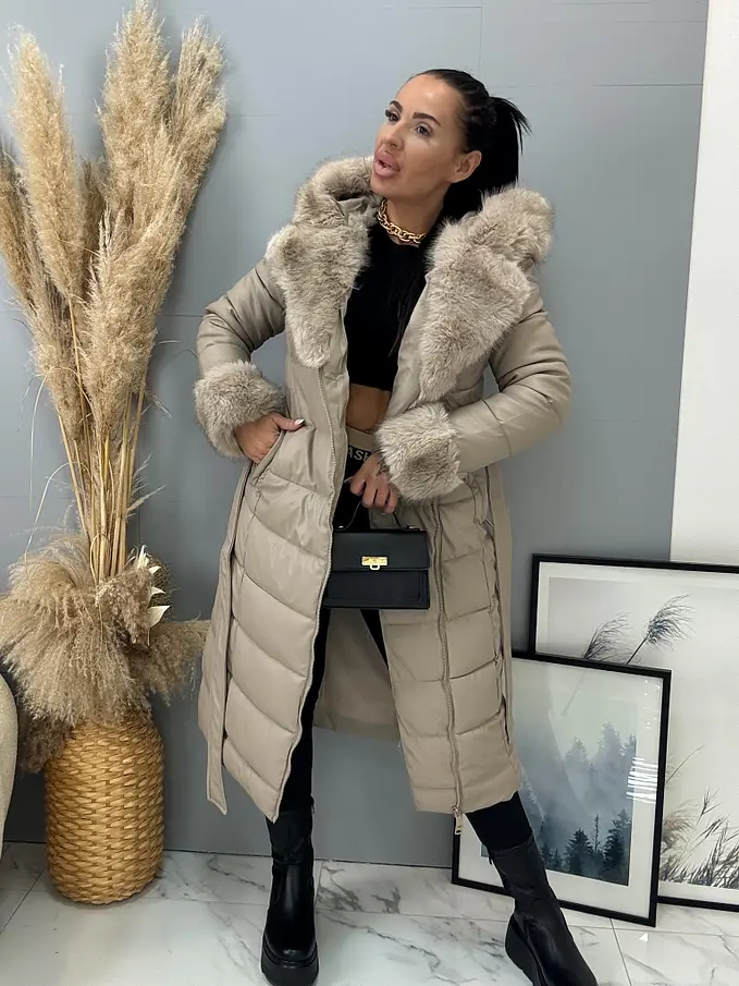 Dlhý koženkový kabát s kožušinou a opaskom NIVORA