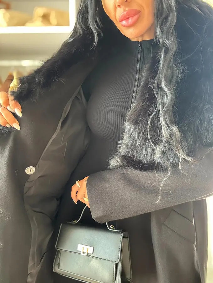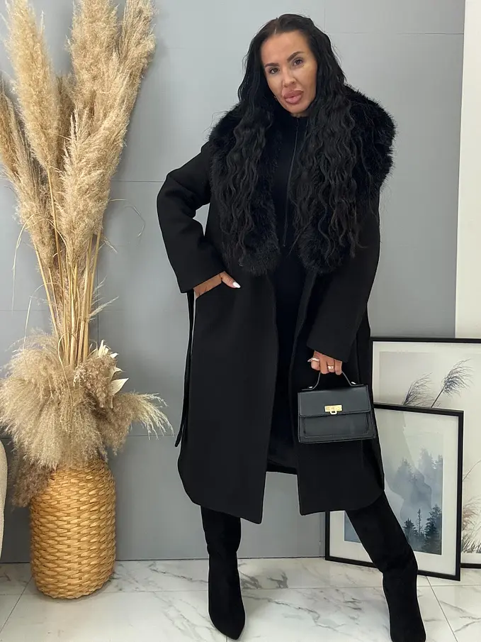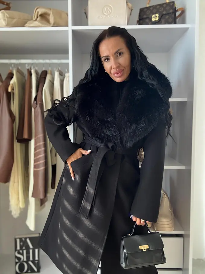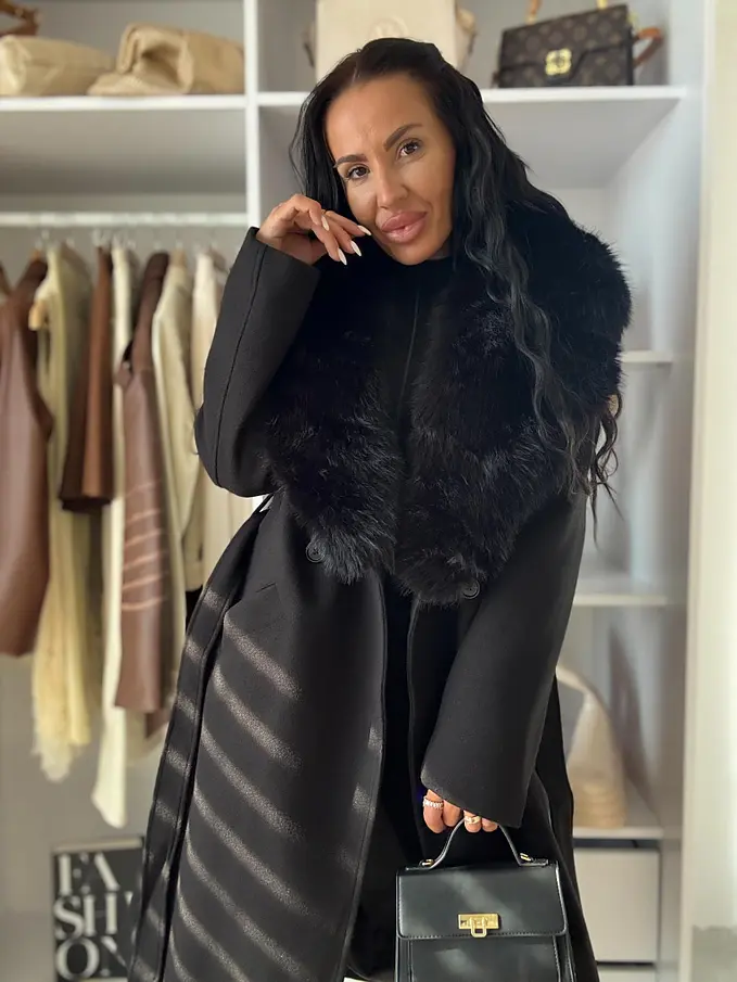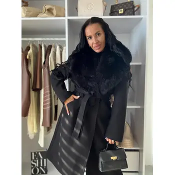 Bunda je vyrobený z príjemného materiálu. S prednými vreckami a s opaskom. S odnímateľným kožušinovým lemom na golieri.
