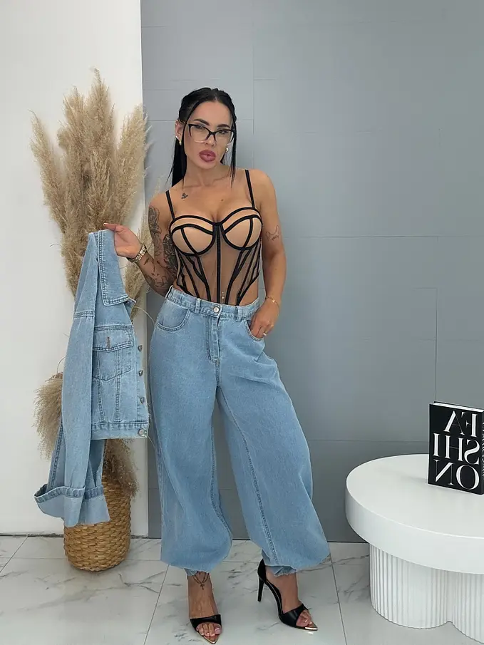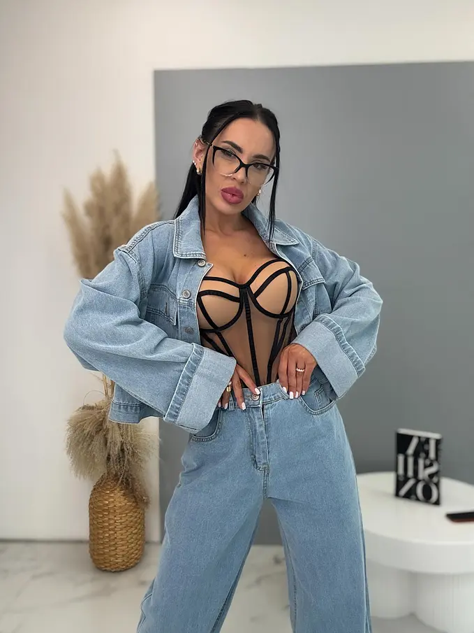 Dámsky komplet z novej kolekcie. Set pozostáva z kabátika a nohavíc. Nohavice majú vysoký a gumený pás. Materiál nie je elastický. Gombíky majú striebornú farbu. Zips zlatú.