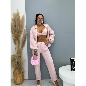 Dámsky komplet z novej kolekcie. Set pozostáva z kabátika a nohavíc. Nohavice majú vysoký a gumený pás. Materiál je jemne elastický. Gombíky majú zlatú farbu. Zips stribornú. Bunda s elastickým pásom.