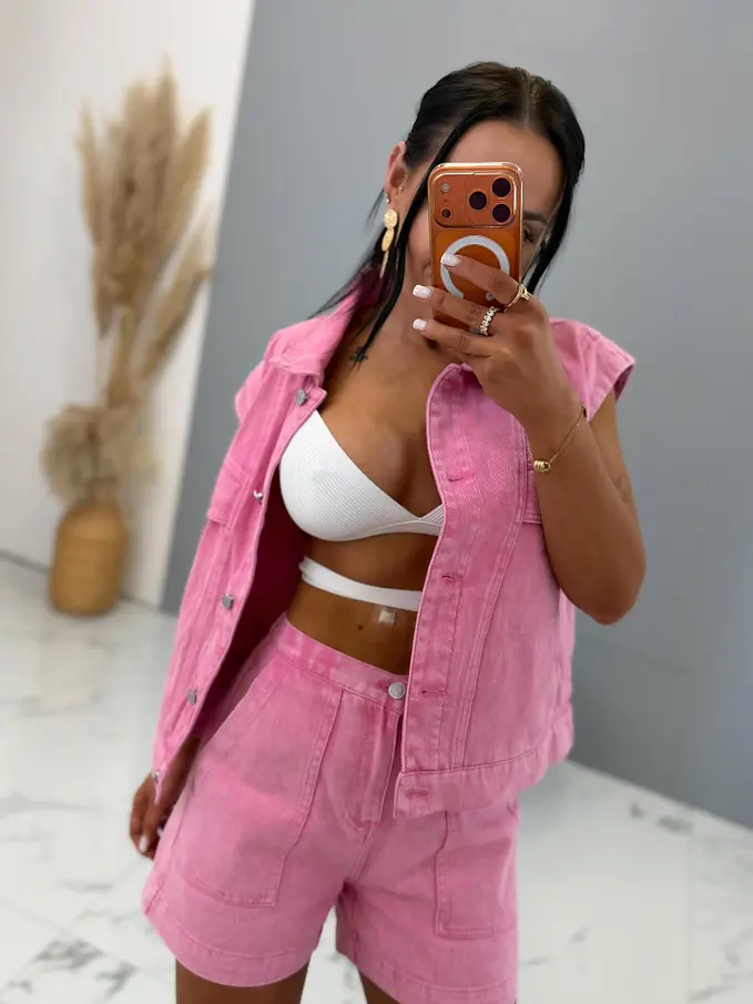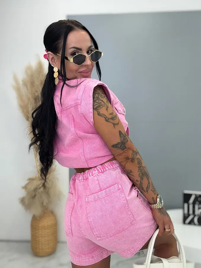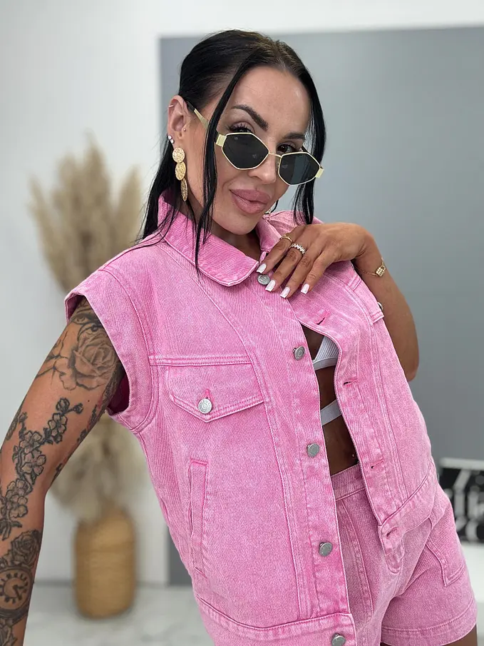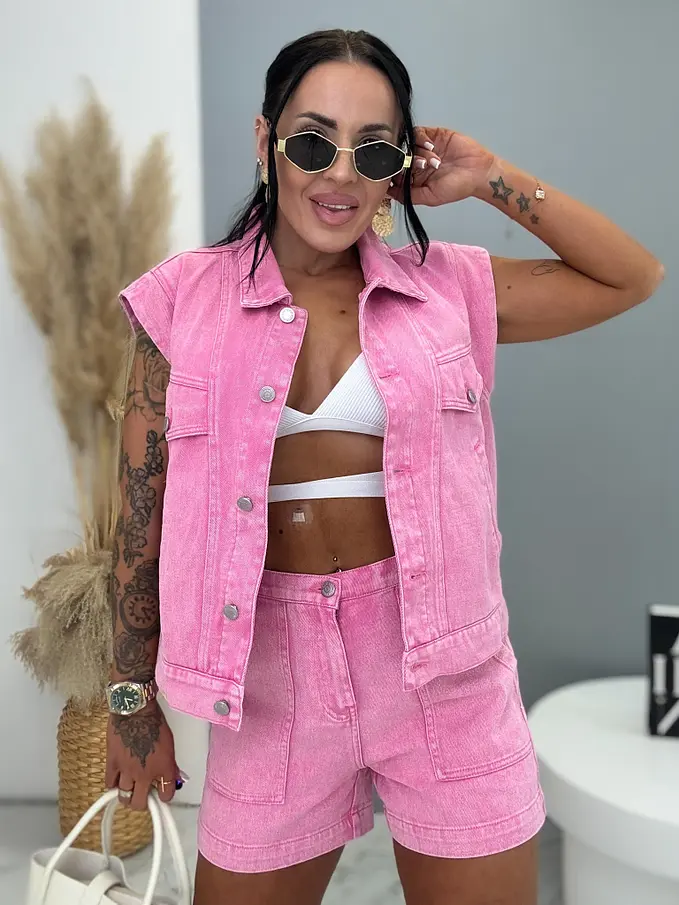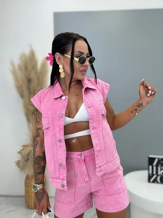 Premium kvalita. Dámsky dvojdielny denimový komplet – vesta a šortky. Materiál nie je elastický. Vesta sa zapína na strieborné gombíky a bočnými vreckami. Šortky s praktickými funkčnými vreckami.