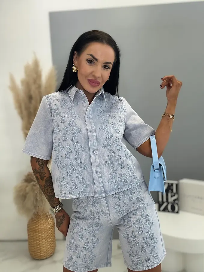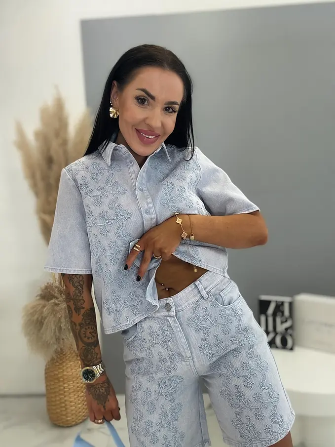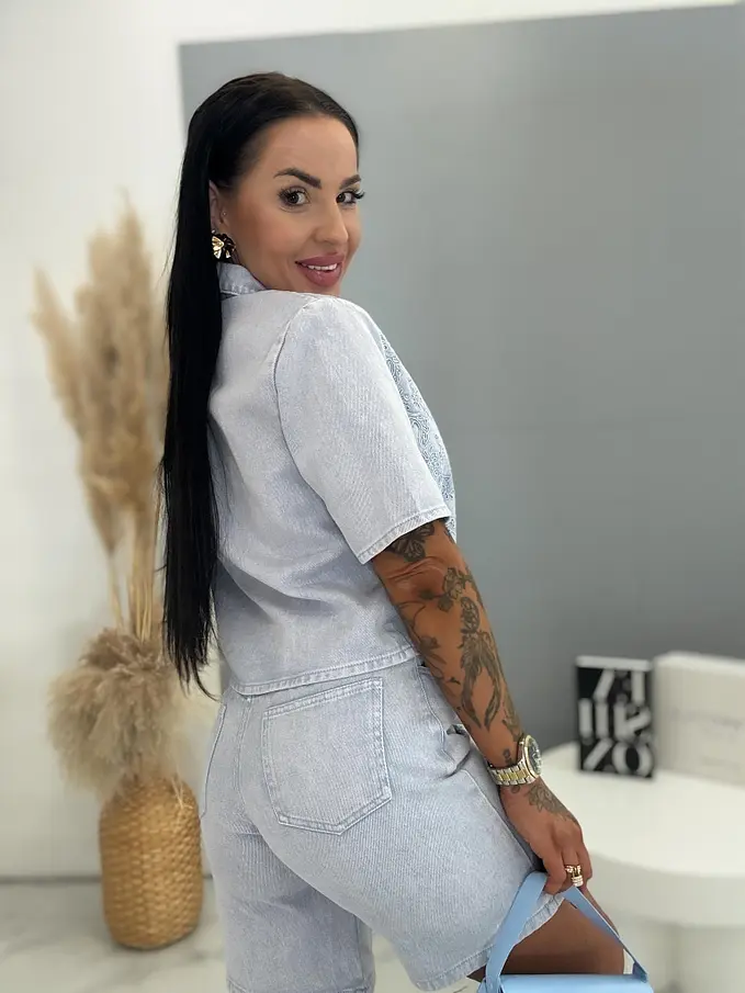 Premium kvalita. Dámsky dvojdielny denimový komplet – košeľa s krátkym rukávom a šortky. Materiál nie je elastický. Košeľa sa zapína na cvoky a je zdobená výšivkou. Šortky s výšivkou a praktickými funkčnými vreckami.