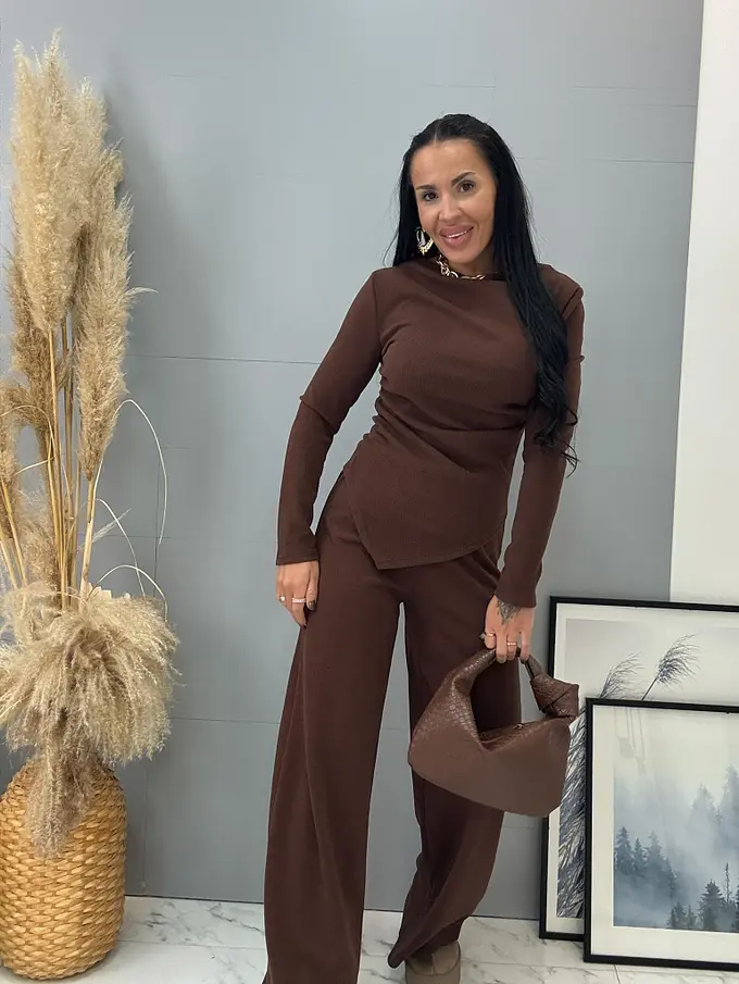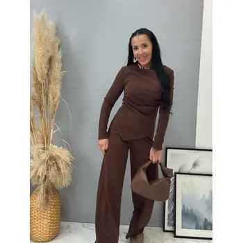 Dámsky komplet z novej kolekcie. Pozozstáva z pulovra a nohavíc. Nohavice majú gumený pás. Materiál je príjemný, elastický.