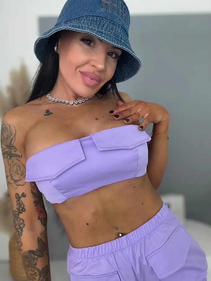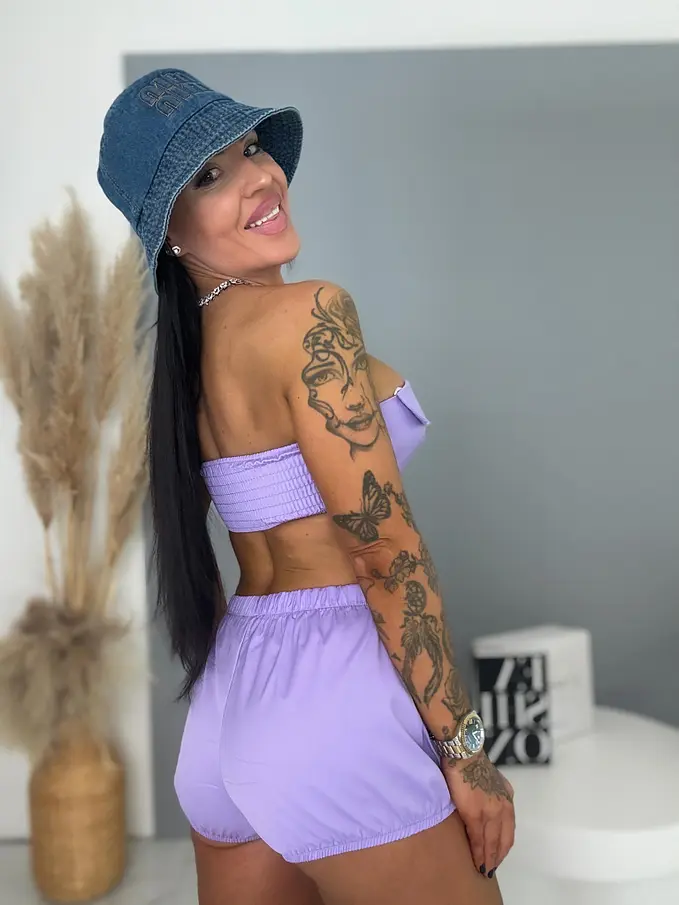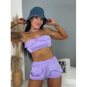 Dvojdielny komplet je ideálnou voľbou pre moderné ženy. Skladá sa z crop - topu a šortky. Materiál je príjemný a elastický. Vrchný diel má na zadnej strane elastickú vsadku a spodný diel tvoria šortky s elastickým pásom.