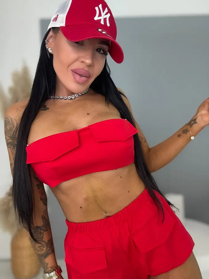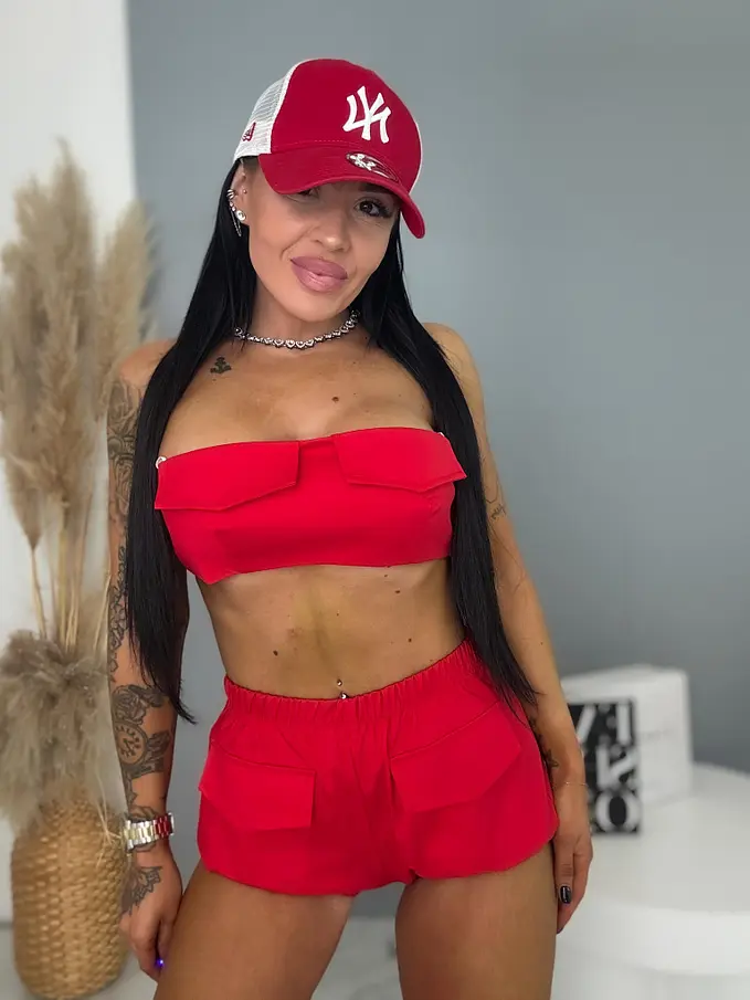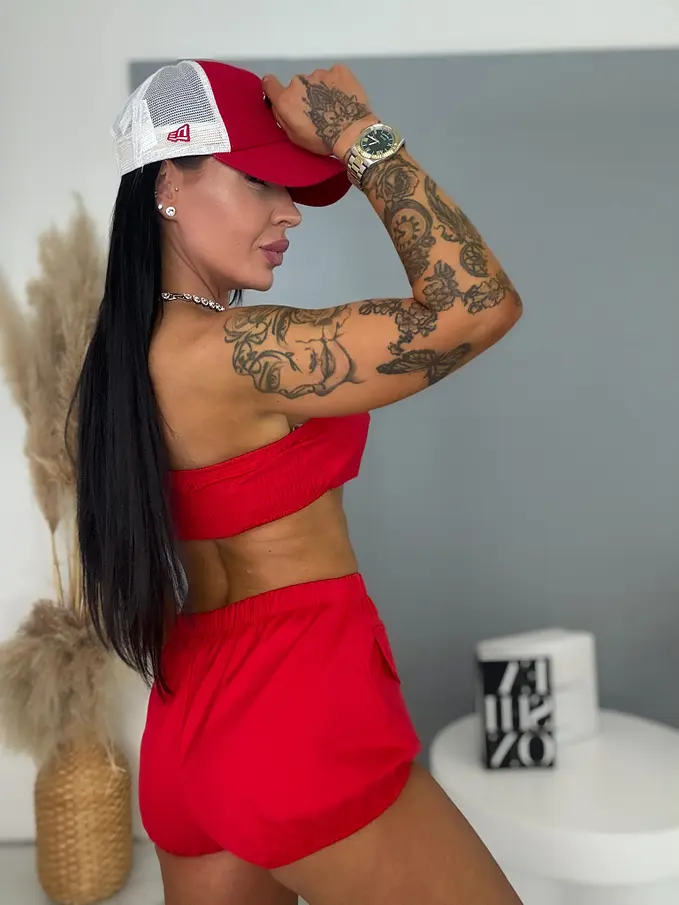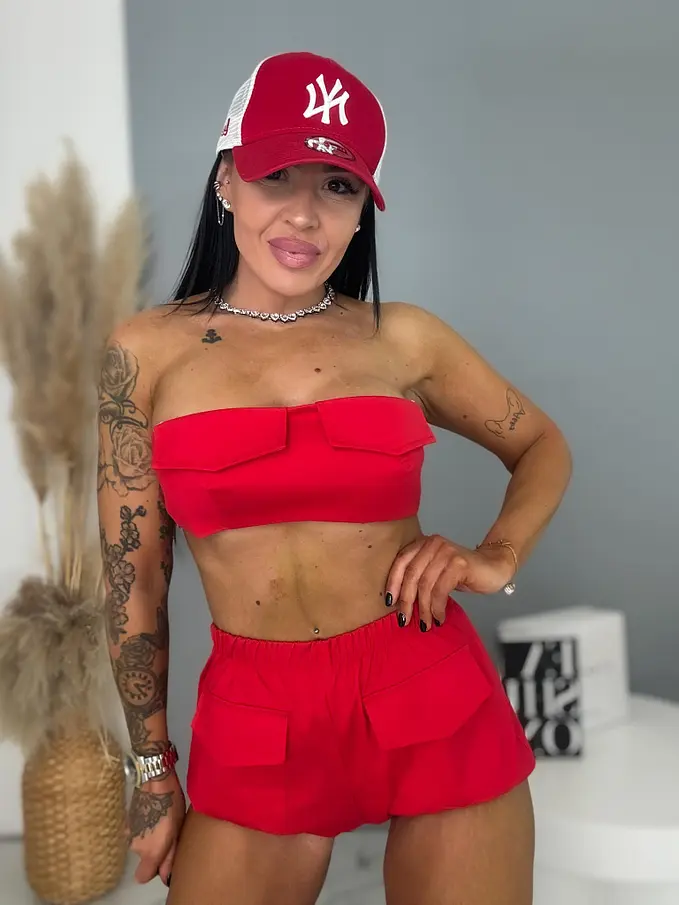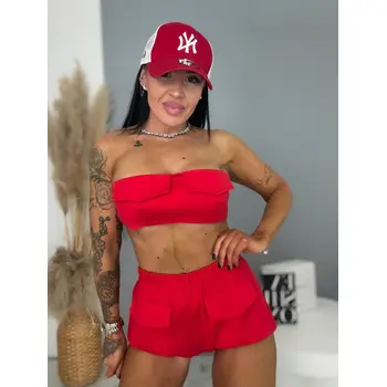 Dvojdielny komplet je ideálnou voľbou pre moderné ženy. Skladá sa z crop - topu a šortky. Materiál je príjemný a elastický. Vrchný diel má na zadnej strane elastickú vsadku a spodný diel tvoria šortky s elastickým pásom.