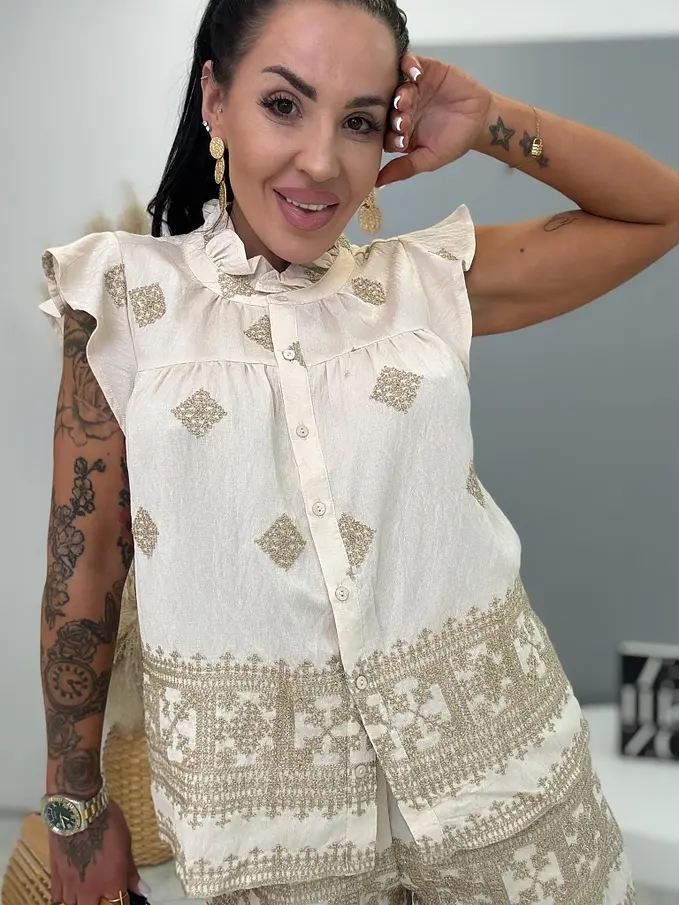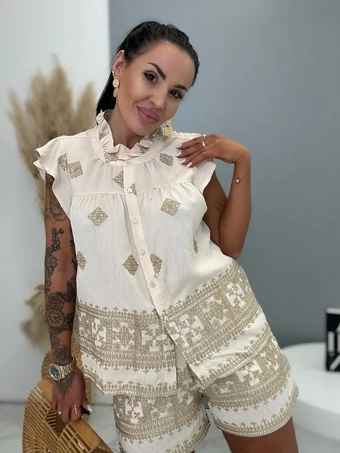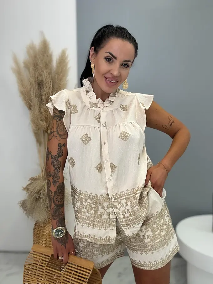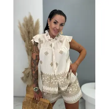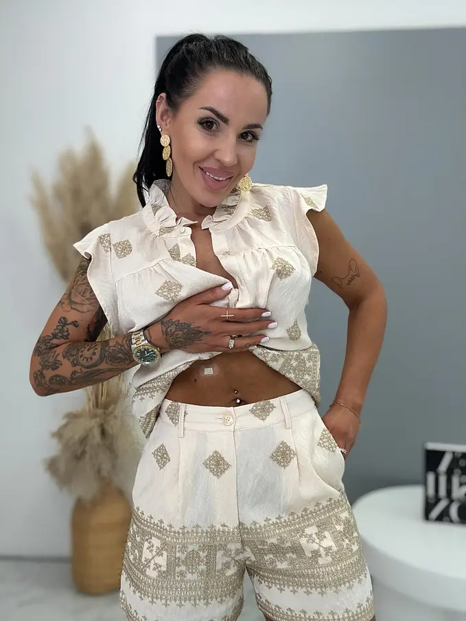 Premium kvalita. Dámsky dvojdielny komplet – košeľa s krátkym rukávom a šortky. Materiál nie je elastický. Košeľa sa zapína na gombíky a je zdobená s trblietavým motívom. Šortky s trblietavým motívom a praktickými funkčnými vreckami a elastickým pásom.