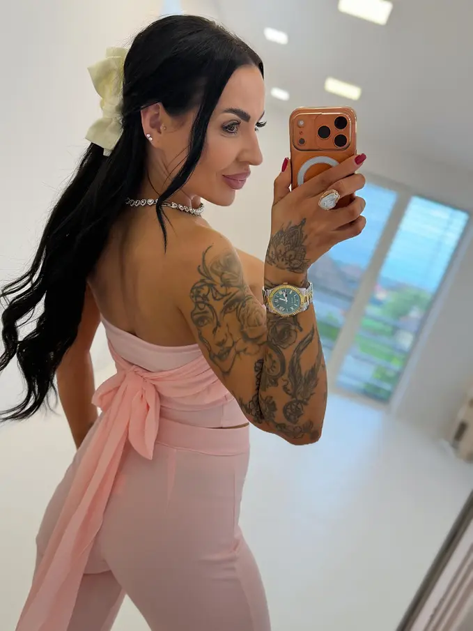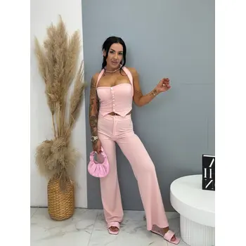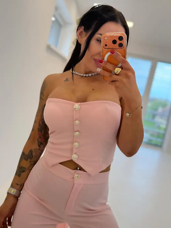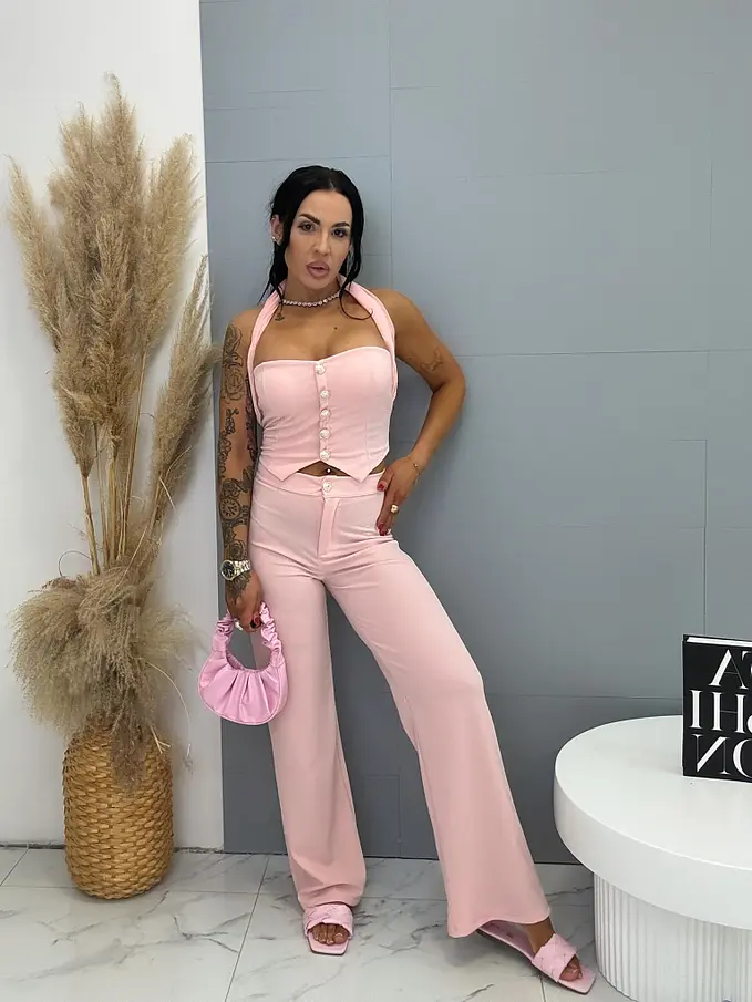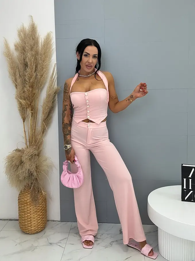 Dvojdielny komplet z novej kolekcie priamo z Talianska. Pozostáva z crop topu a nohavíc. Materiál je príjemný, elastický. Crop top s vypchávkami je na viazanie a je ozdobený zlatými gombíkmi.