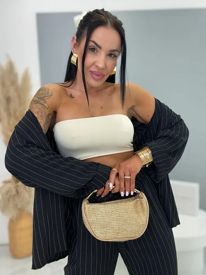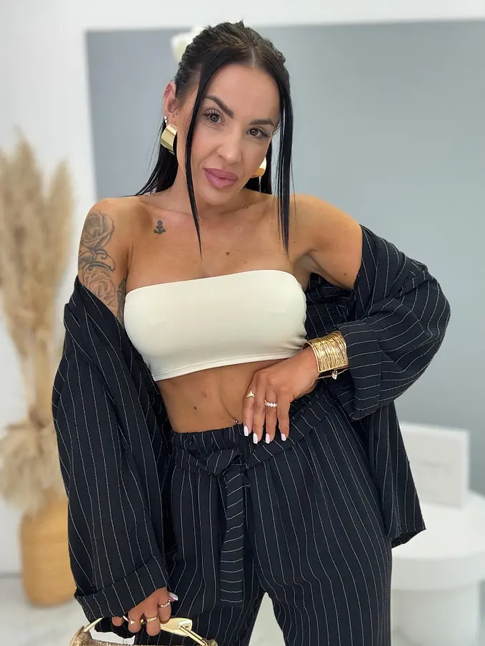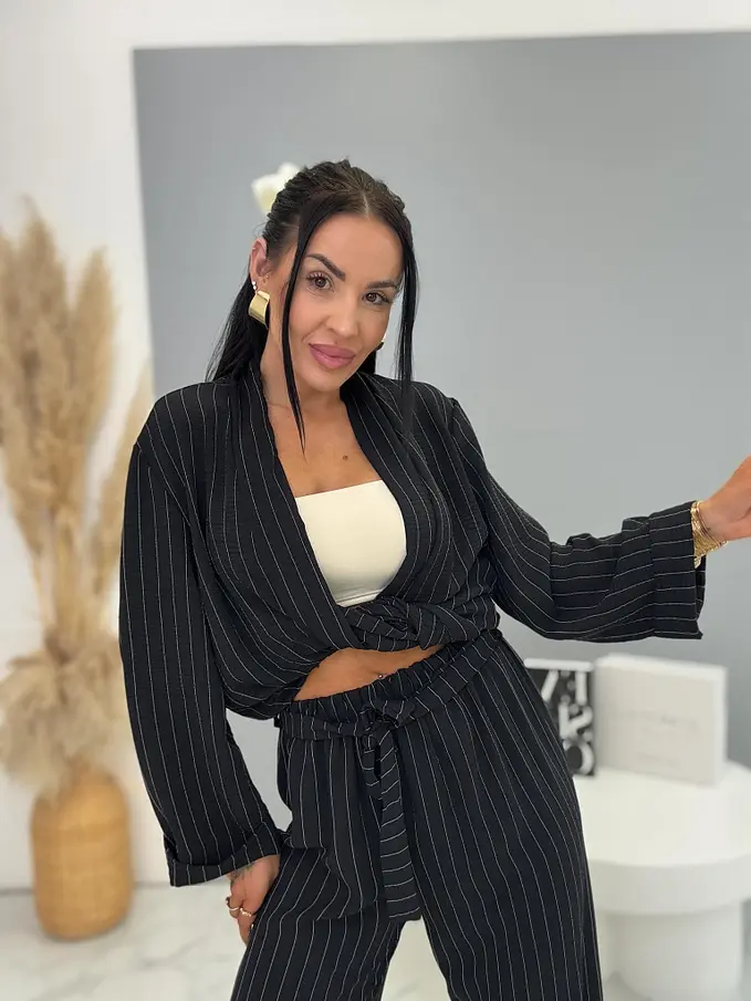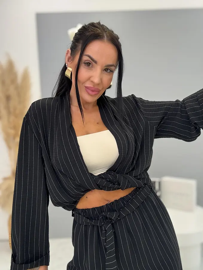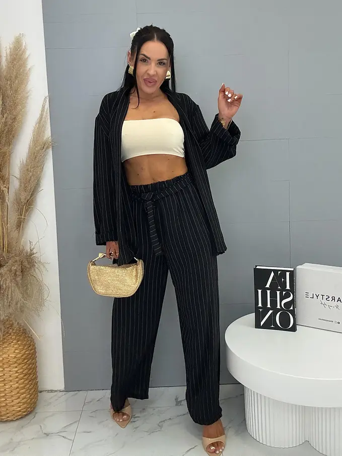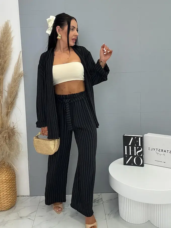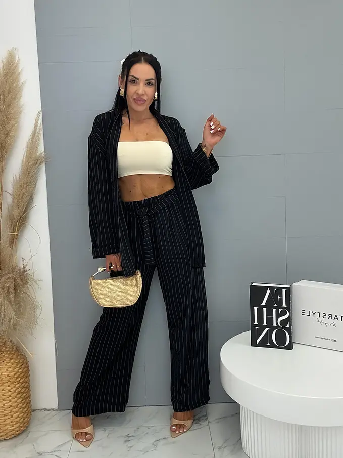 Dámský komplet z novej kolekcie. Pozozstáva zo saka a nohavíc. Materiál je elastický. Nohavice s gumeným pásom a opaskom. Sako má ležerný strih.