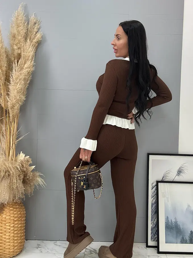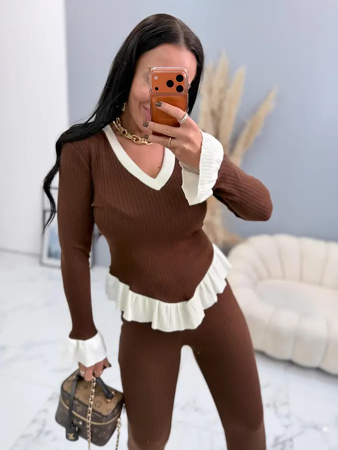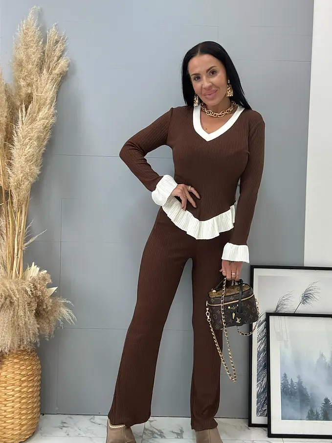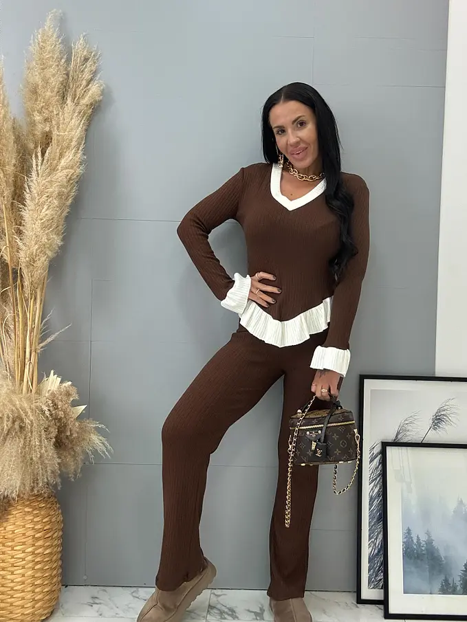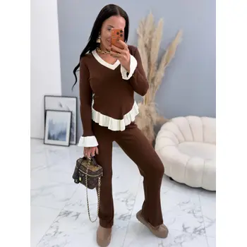 Dámsky komplet z novej kolekcie. Pozozstáva z pulovra a nohavíc. Nohavice majú gumený pás. Materiál je príjemný, elastický. Ozdobená volánom.