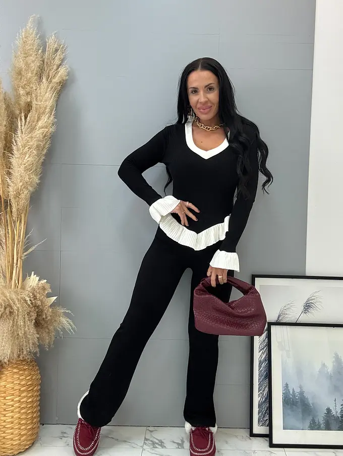 Dámsky komplet z novej kolekcie. Pozozstáva z pulovra a nohavíc. Nohavice majú gumený pás. Materiál je príjemný, elastický. Ozdobená volánom.