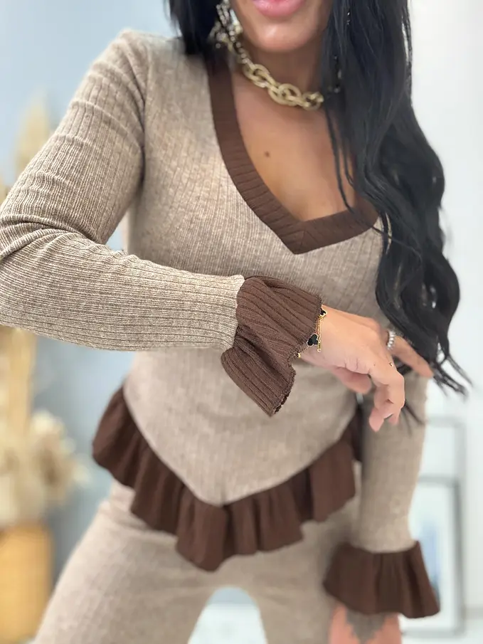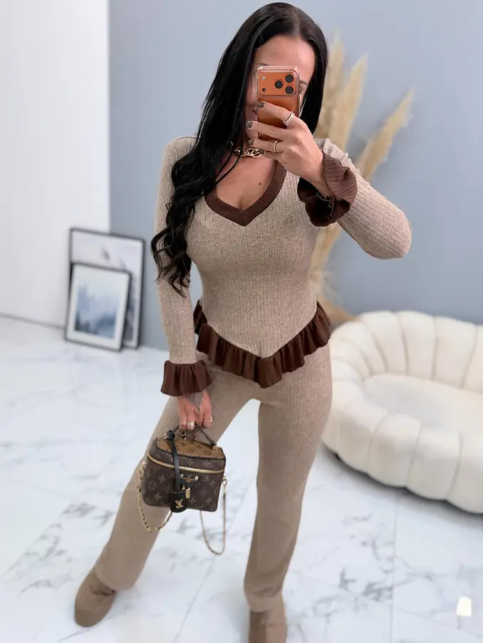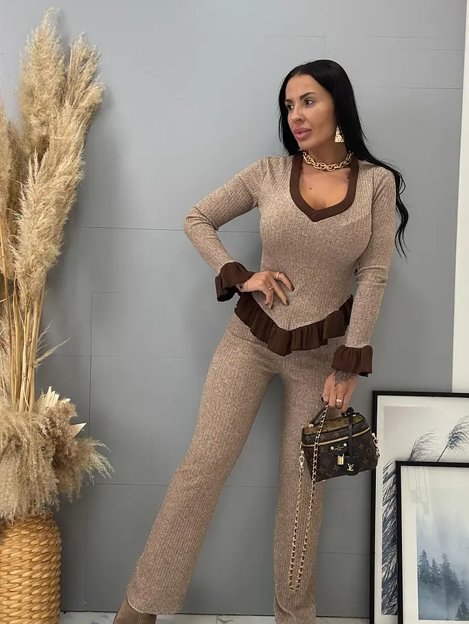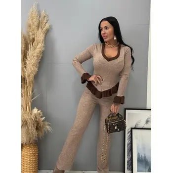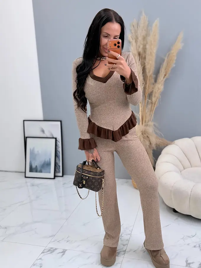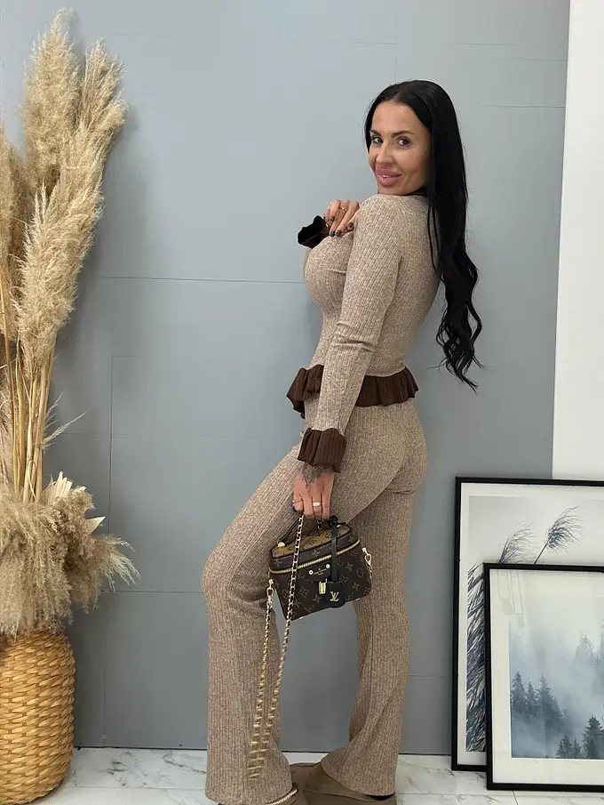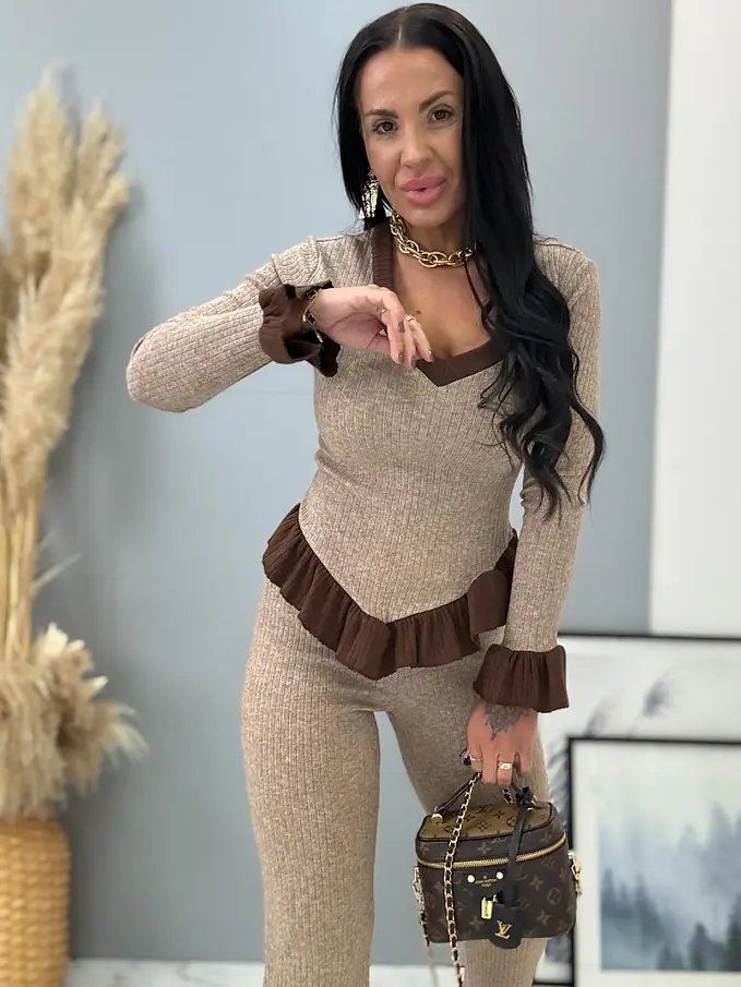 Dámsky komplet z novej kolekcie. Pozozstáva z pulovra a nohavíc. Nohavice majú gumený pás. Materiál je príjemný, elastický. Ozdobená volánom.