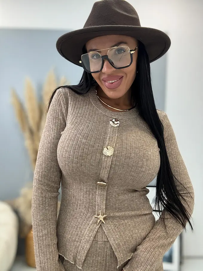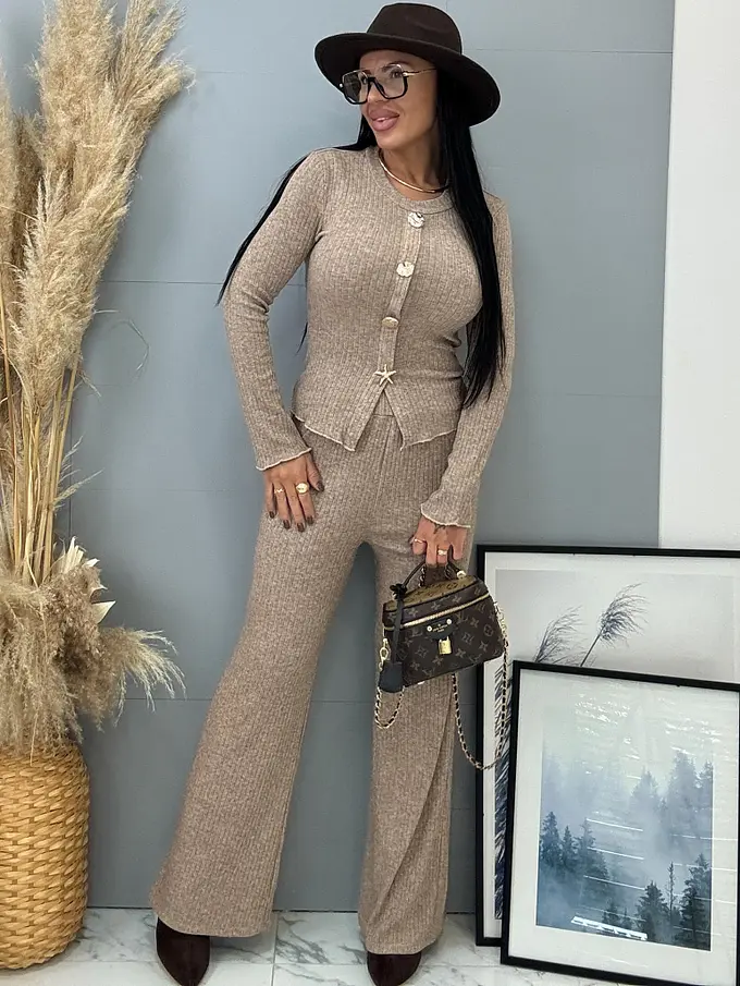 Dámsky komplet z novej kolekcie. Pozozstáva z pulovra a nohavíc. Nohavice majú gumený pás. Materiál je príjemný, elastický. Ozdoby majú zlatú farbu. Hviezdicová ozdoba je odnímateľná.